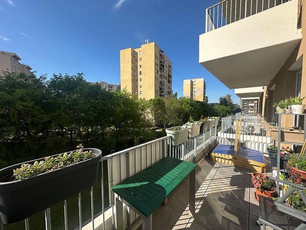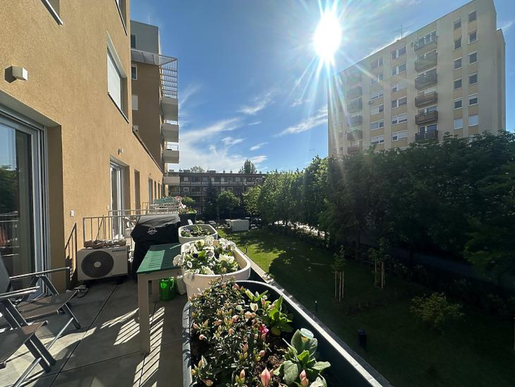 A nappaliból és a hálószobából is elérhető, közel 10 m²-es terasz egy parkos, csendes sétányra néz — ideális a nyugodt kikapcsolódáshoz.