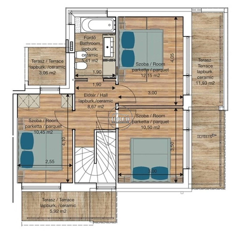 • 106 m² netto lakótér, belső kétszintes elrendezés