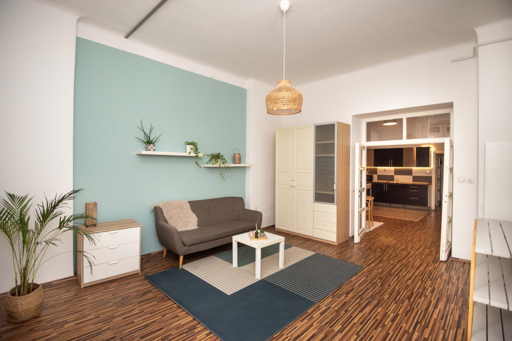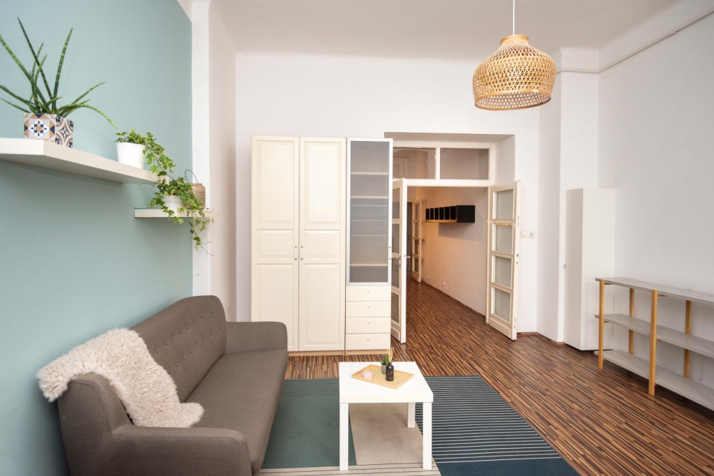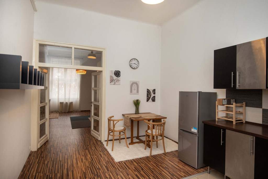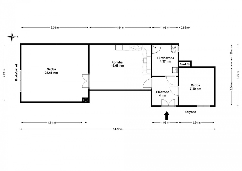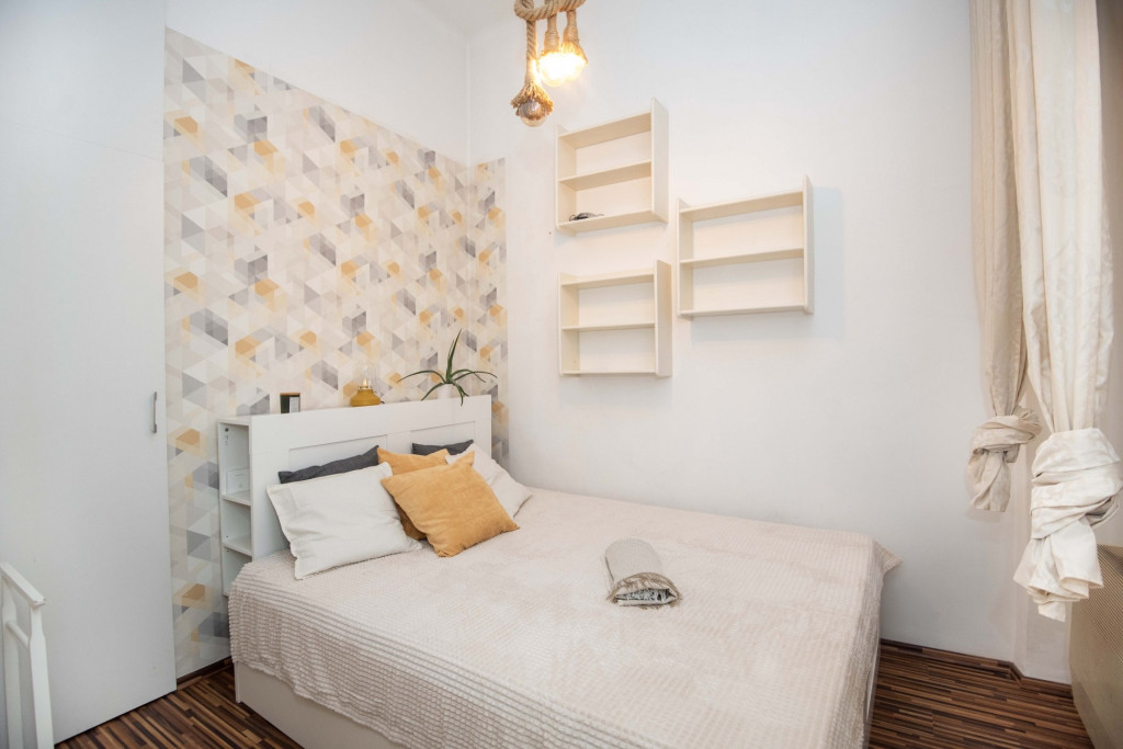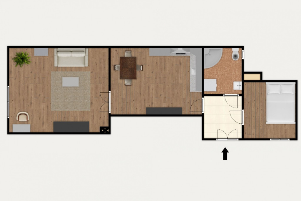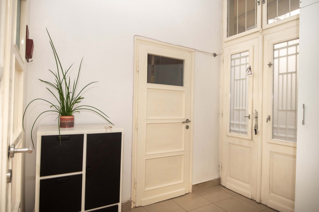 Az elrendezés kiegyensúlyozott és átgondolt, a déli tájolású, utcai nézetű nappali világos, elegáns élettérként szolgál a mindennapokhoz, míg a belső udvarra néző hálószoba csendesebb, intimebb környezetet biztosít a pihenéshez. A különnyíló szobák jól elkülöníthető, harmonikusan használható tereket hoznak létre.