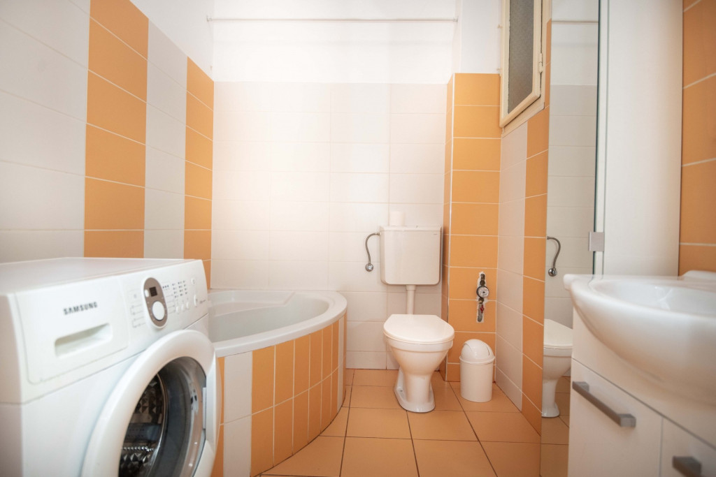A fürdőszoba sarokkádas kialakítású, amely egy hosszú nap végén valódi felüdülést kínál.