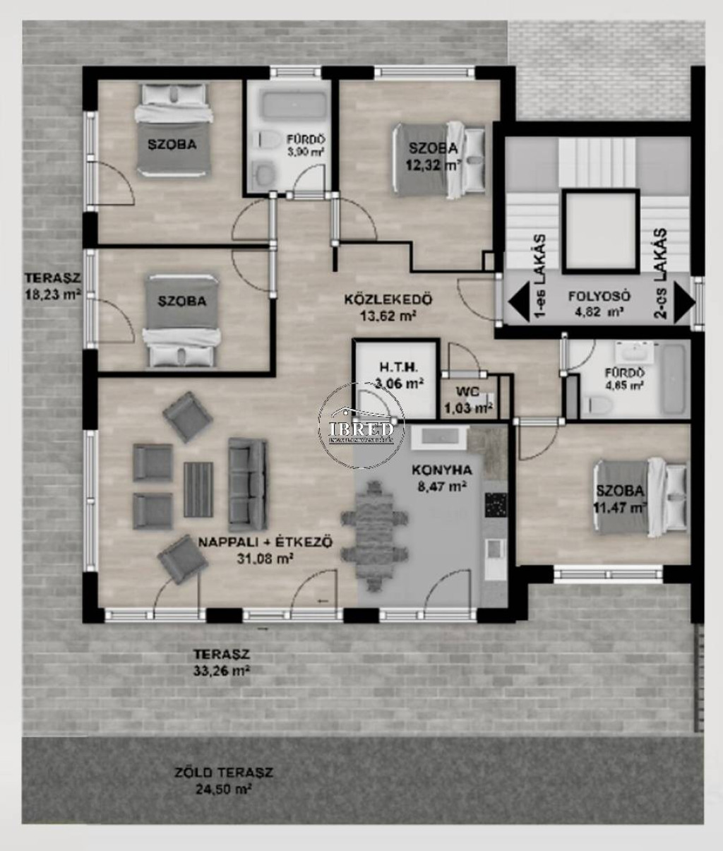 A földszinti lakás beosztása: 40 nm-es amerikai konyhás nappali közvetlen terasz- és kertkapcsolattal; négy külön nyíló, jól bútorozható, kényelmes méretű hálószoba, amelyek közül kettő szintén terasz- és kertkapcsolatos; két, káddal, illetve zuhanyzóval felszerelt fürdőszoba WC-vel; külön vendégmosdó; valamint a konyhából nyíló háztartási helyiség.