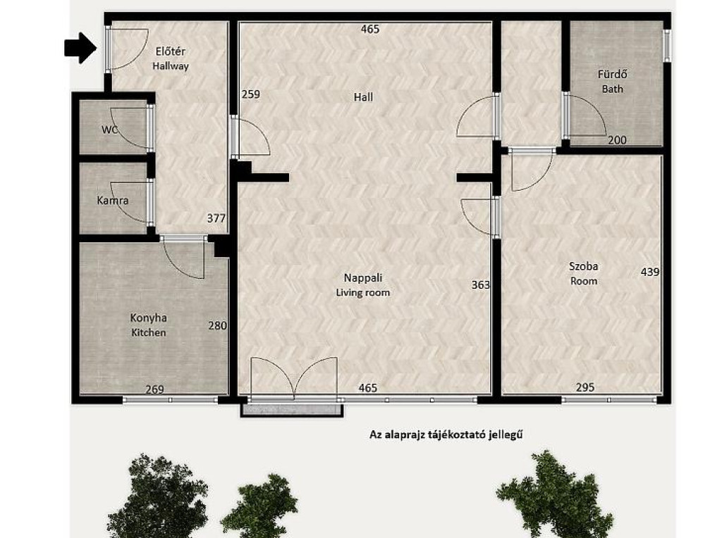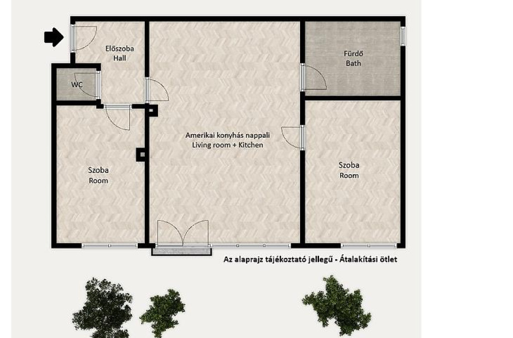 Igény szerint könnyen amerikai konyhás nappali + 2 hálószobássá alakítható.