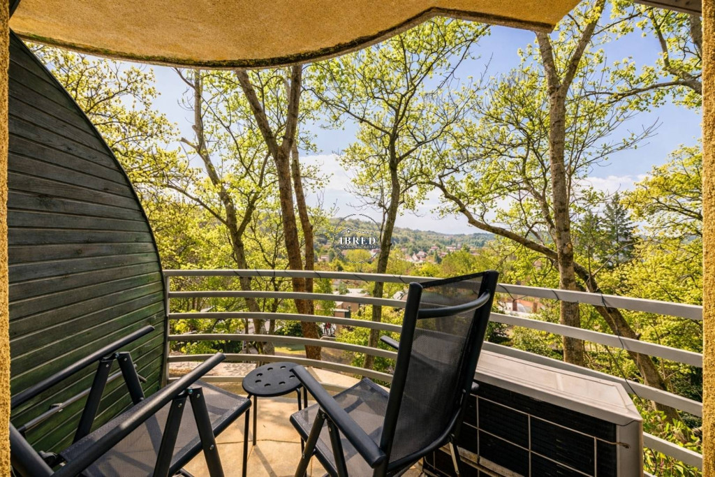 A nappali előtti erkélyről kellemes, kertvárosias, zöld kilátás nyílik. Az épület az utcaszint fölé emelkedik, így a lakásból zavartalan az átlátás a környező domboldalra és a Kútvölgy irányába, ami világos, nyugodt atmoszférát teremt egész nap.