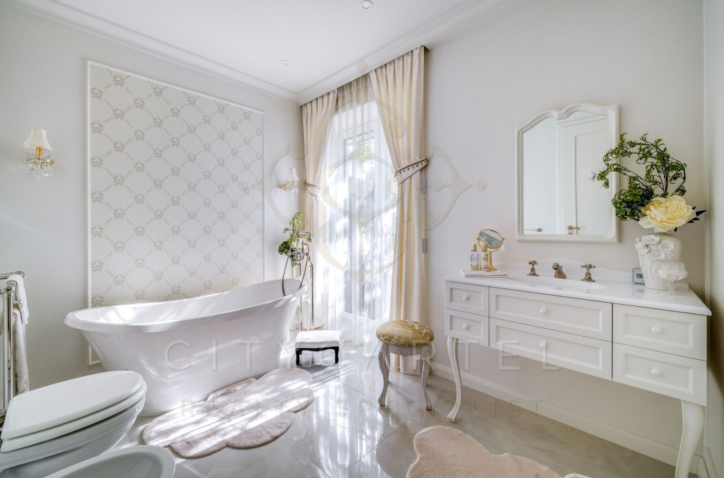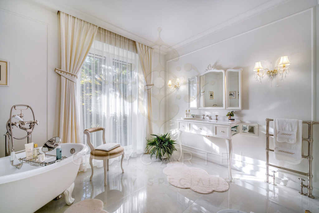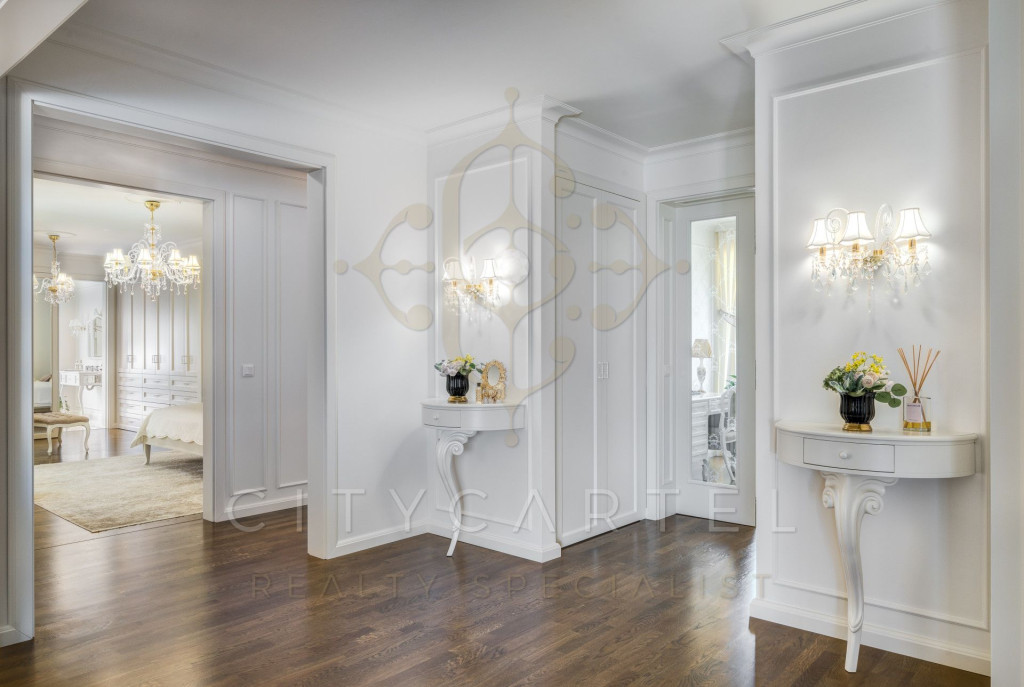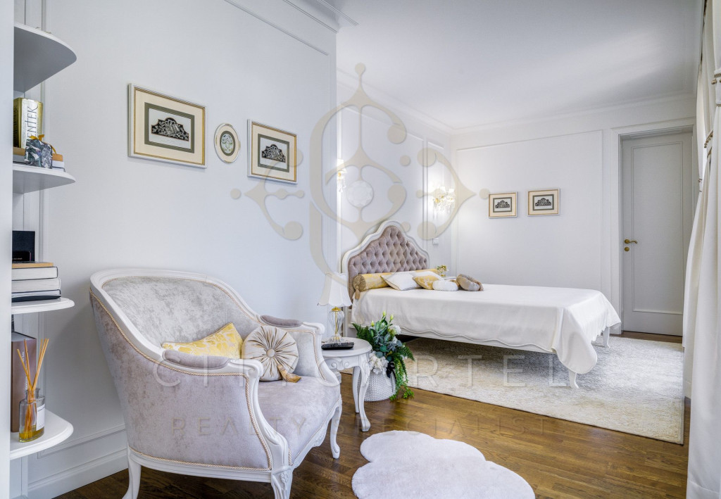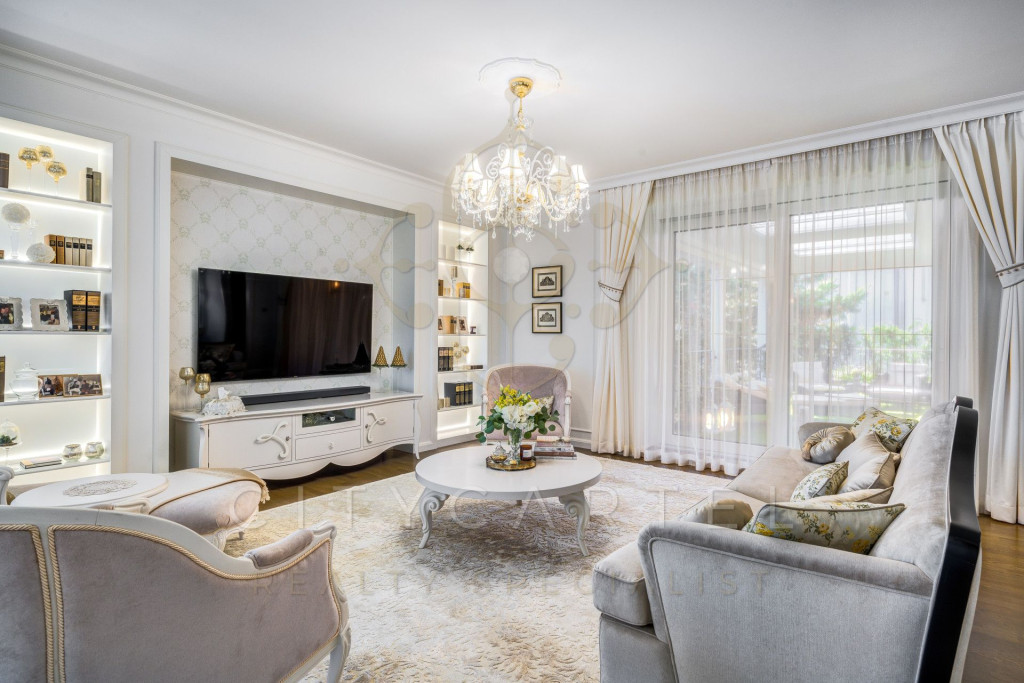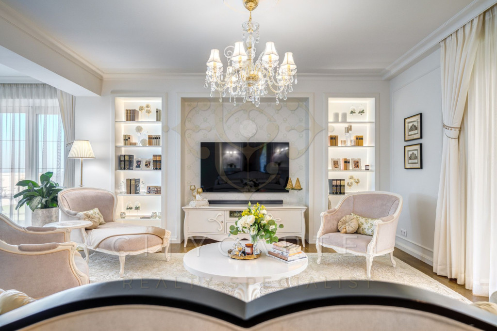 A helyiségek berendezése minden luxusigényt kielégít, ahol az elegáns, aprólékosan kidolgozott modern-klasszikus enteriőr a kifinomult belsőépítészeti és lakberendezői munka tökéletes példája.