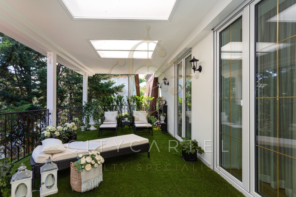 A luxuslakás felső emeleti elhelyezkedése, intim szeparáltsága és műfüves, hatalmas teraszai által olyan érzetet kelt, mintha egy exkluzív családi ház nyugalmát élveznénk.