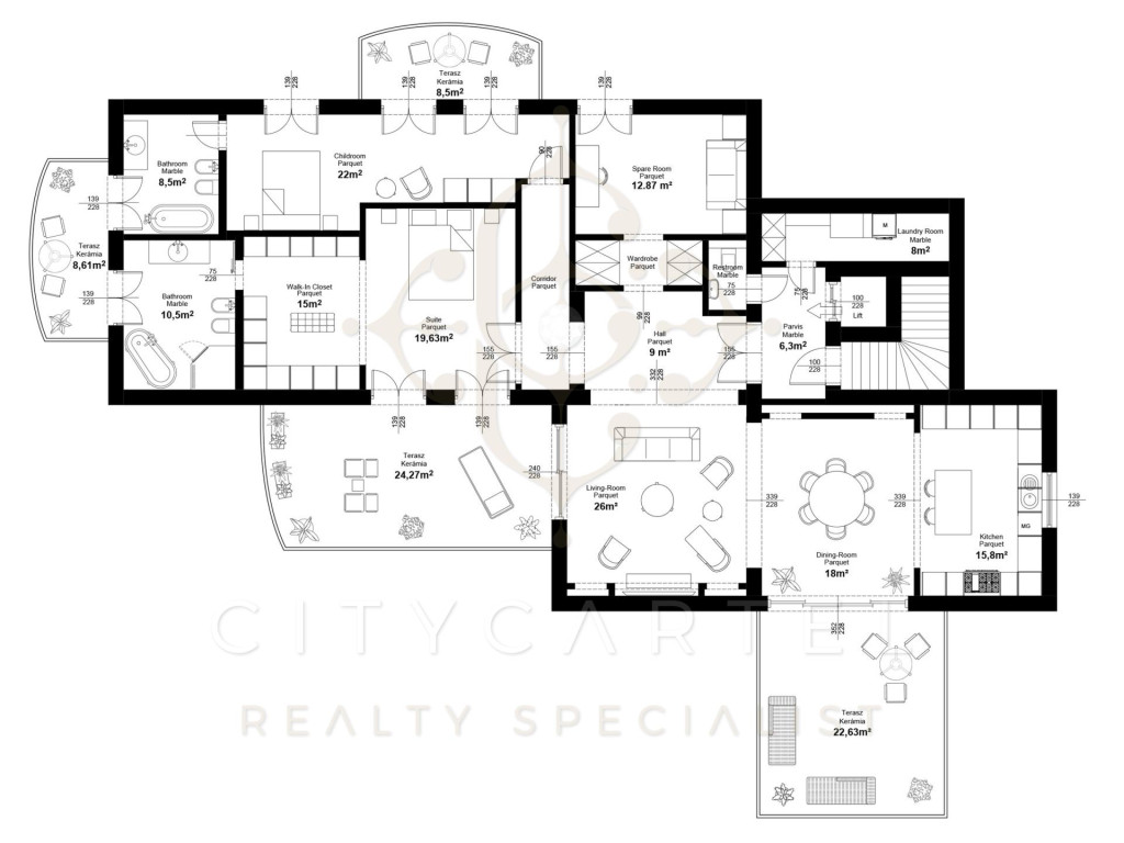 Az apartmanhoz négy különálló, összesen 64 nm-es terasz tartozik, amelyek kiválóan alkalmasak pihenésre, a társasági élet vagy egy meghitt reggeli elfogyasztásának színteréül, lenyűgöző látvánnyal.