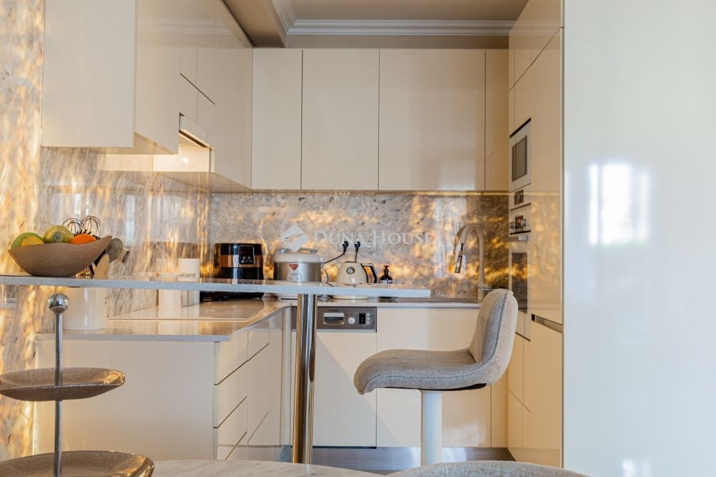 A modern, magasfényű konyhabútor teljesen gépesített, így az ingatlan azonnal költözhető, a beépített bútorok a vételár részét képezik.
