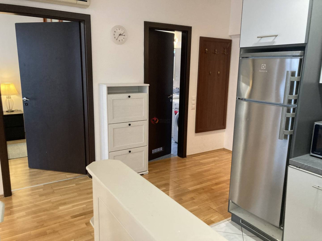 A lakás helyiségei tágasak, jól berendezhetőek. A nagy ablakokkal rendelkező, világos nappali egy légtérben van a pulttal elválasztott konyhával, ami teljesen gépesített, beépített konyhabútorral rendelkezik.