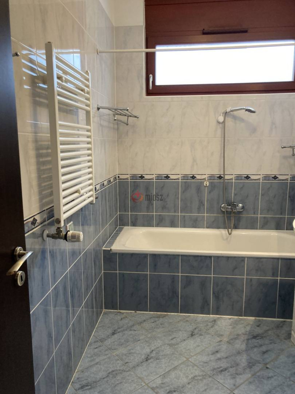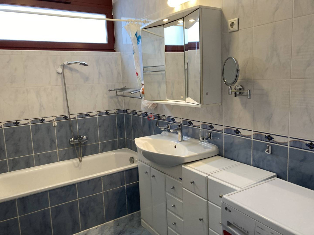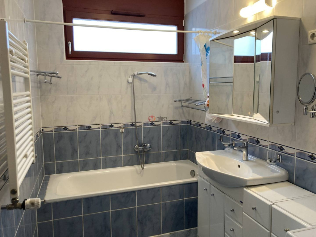 Az ablakkal is rendelkező fürdő is igen tágas, mosógép, szárítógép is elfér, a törölköző szárító kellemes meleget biztosít. Külön helyiségben van a WC.