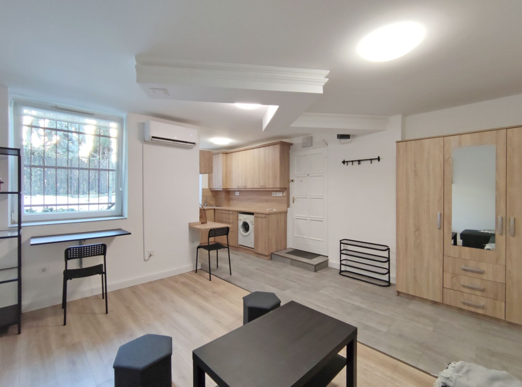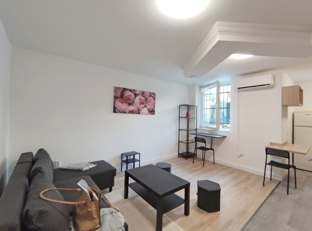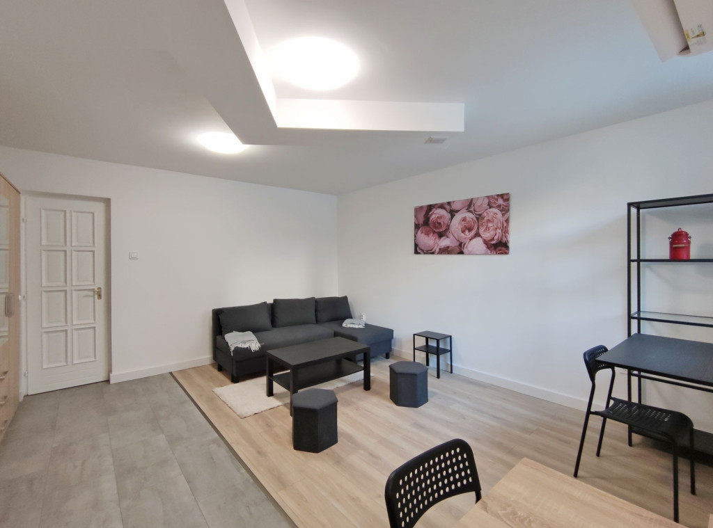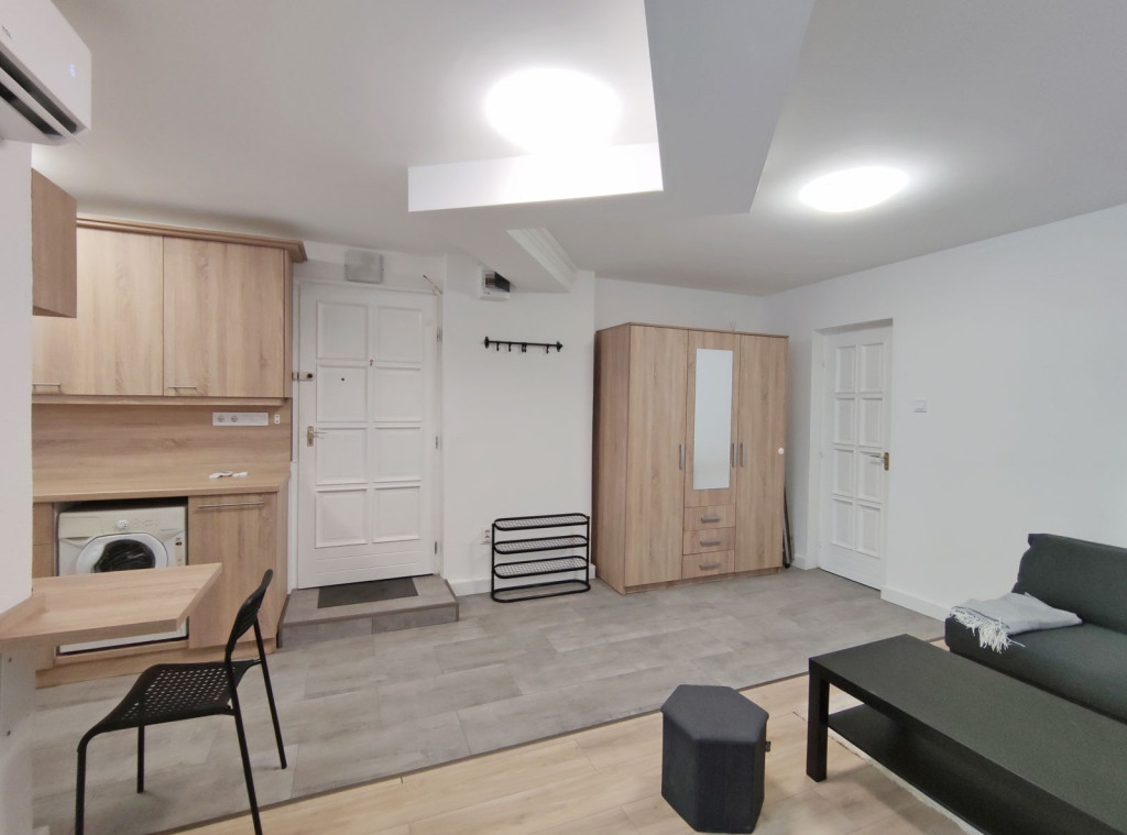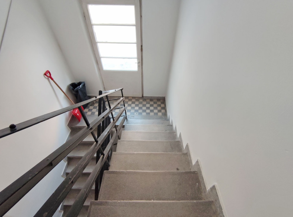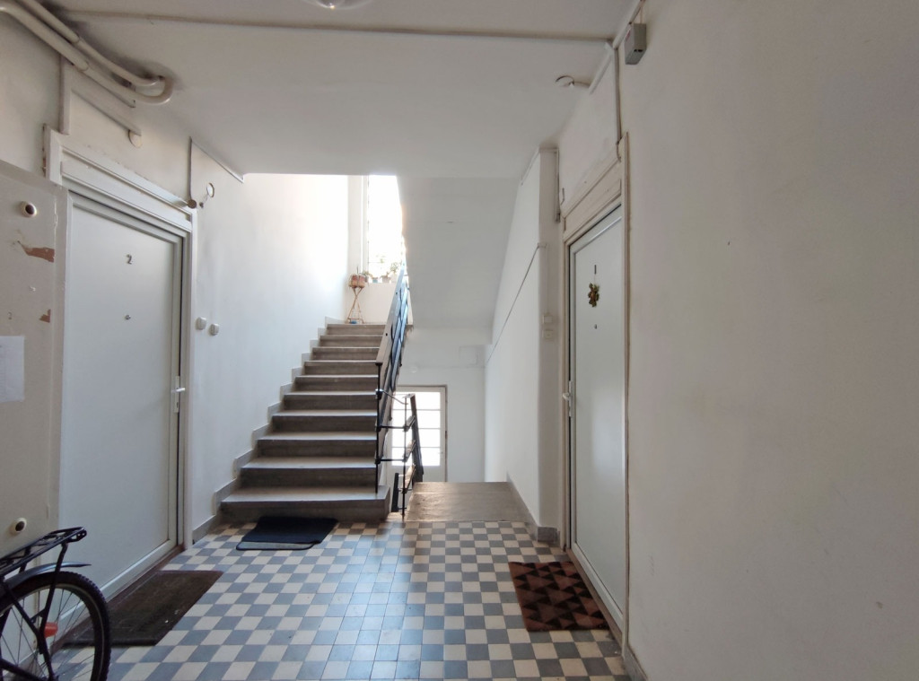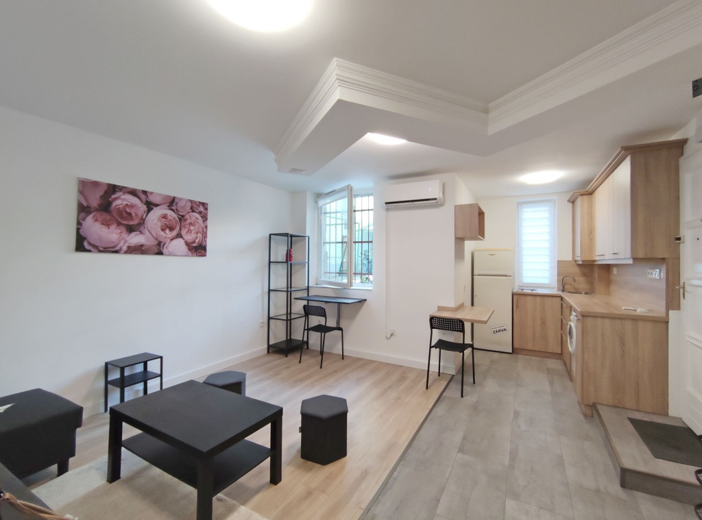 A földszintről lefelé hét lépcső vezet a lakásba, belépni a ráccsal ellátott, több ponton záródó biztonsági ajtón keresztül tudunk. A teljes körűen felújított, frissen festett, bútorozott tágas nappaliba lépünk be, amely részben járólappal , és parkettával burkolt, így növelve a kényelmet és a teret. Vele egy légtérben található, a gépesített elektromos tűzhellyel , mosogatógéppel ellátott bútorozott ablakos konyha. A szoba ablakából a körbekerített belső zöld udvarra látunk, amit jelenleg a házból nem használnak a lakók, ezért van lehetőség arra hogy grillezős, pihenős környezetté alakítsa az új lakó és reggelente a friss levegőn kávézhasson.