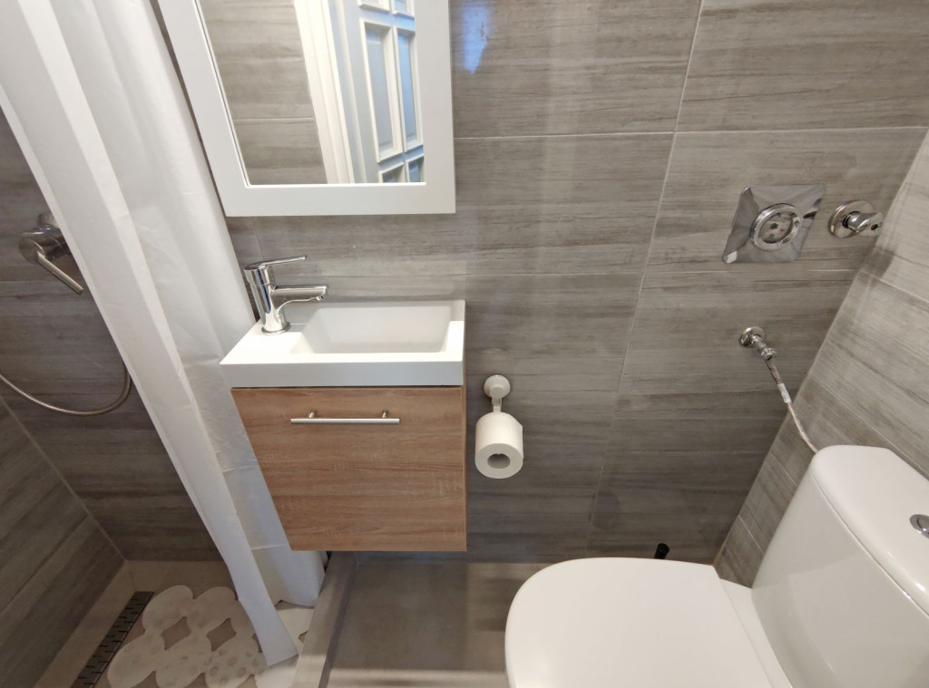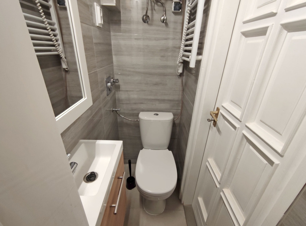 A nappaliból balra nyílik a szintén újonnan burkolt zuhanyzós kialakítású fürdő, itt kapott helyet a WC -is.