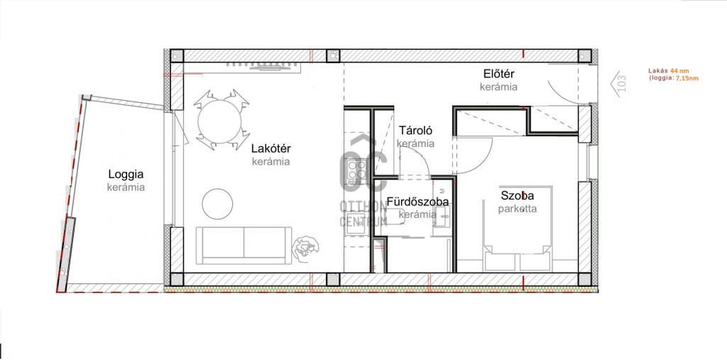 Ez az 1. emeleti, nappali-étkező-konyha +1 szobás lakás 44 nm-es +7,15 nm-es loggiával.