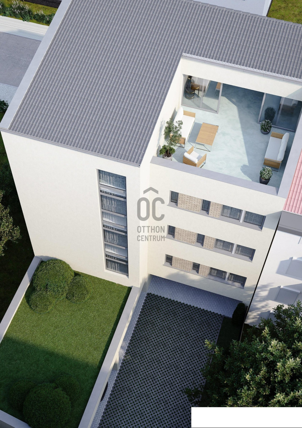 Földszinten egy 33 m2 - es iroda + a gépkocsi parkolók kerülnek kialakításra, 1 - 2 - 3 emeleten szintenként 2 db lakás, + a 4. emeleten egy tetőtéri, nettó 70 m2 - es iroda kerül megépítésre.