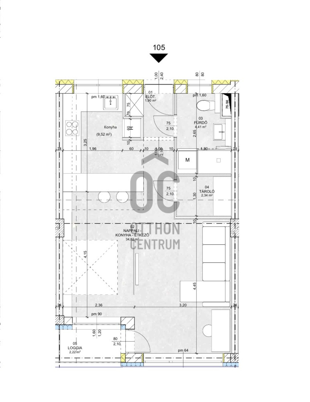 Ez az 1. emeleti lakás 43,47 nm-es, nappali-étkező-konyhás, 2,22 nm-es loggiával.