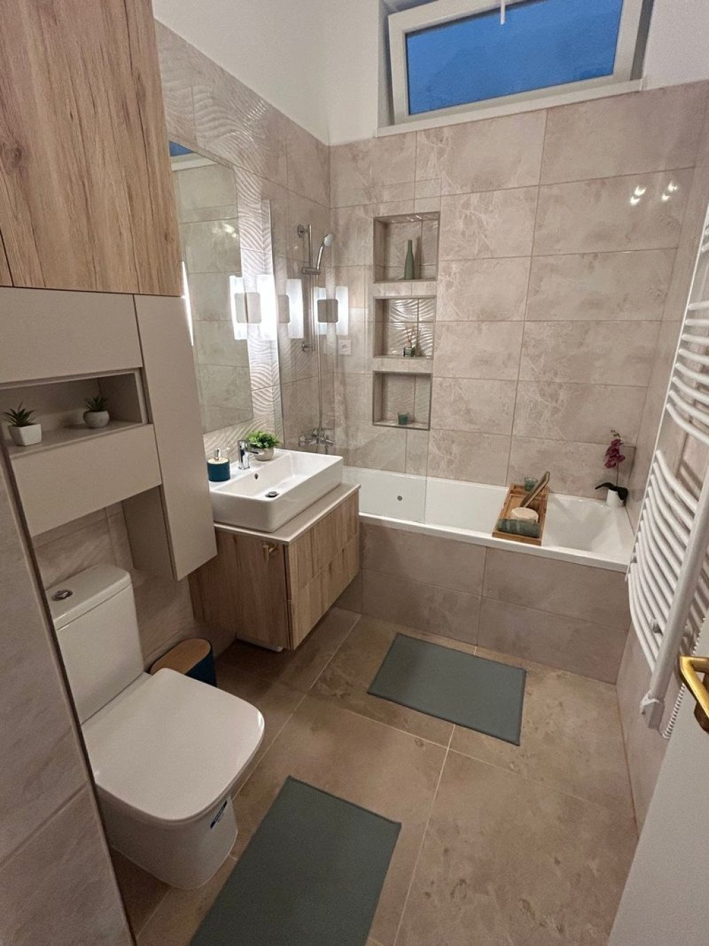 - a kádas kialakítású, fali törölközőszárítóval ellátott fürdőszoba és a WC egy légtérben találhatóak, a mosógép külön helyiségben (előszoba) került elhelyezésre