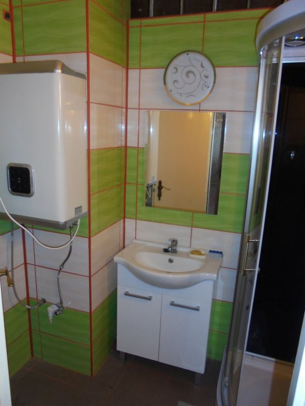 - a zuhanykabinos kialakítású, bővíthető fürdőszoba és a WC külön légtérben találhatóak, a melegvizet egy Ariston típusú villanybojler biztosítja