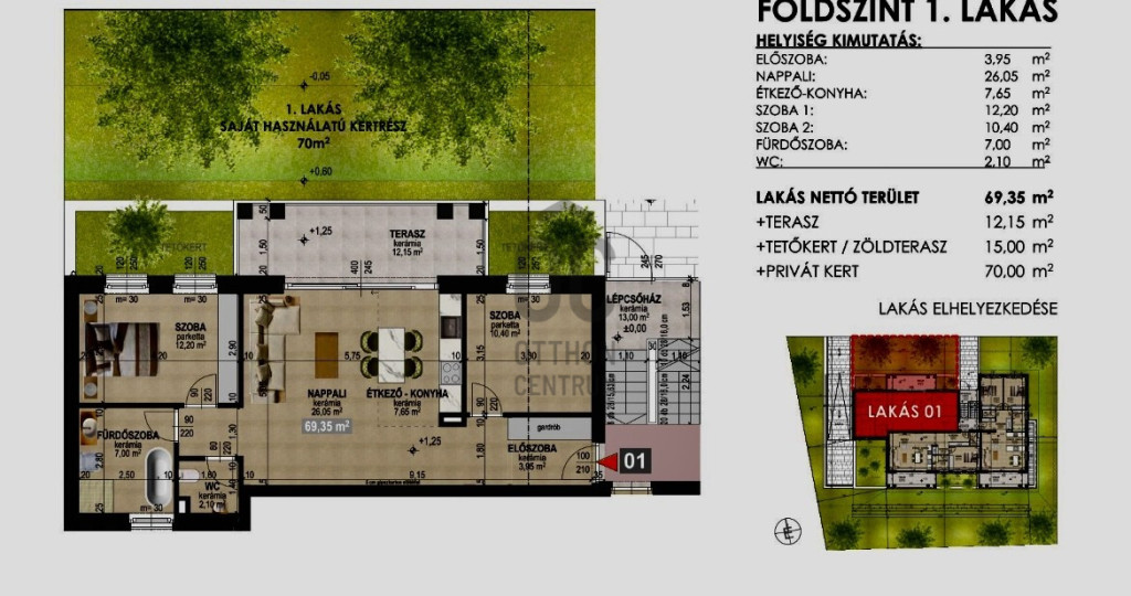 Földszint 3 lakás: 69.75 nm + 12.15 nm terasz + 177 nm privát kert