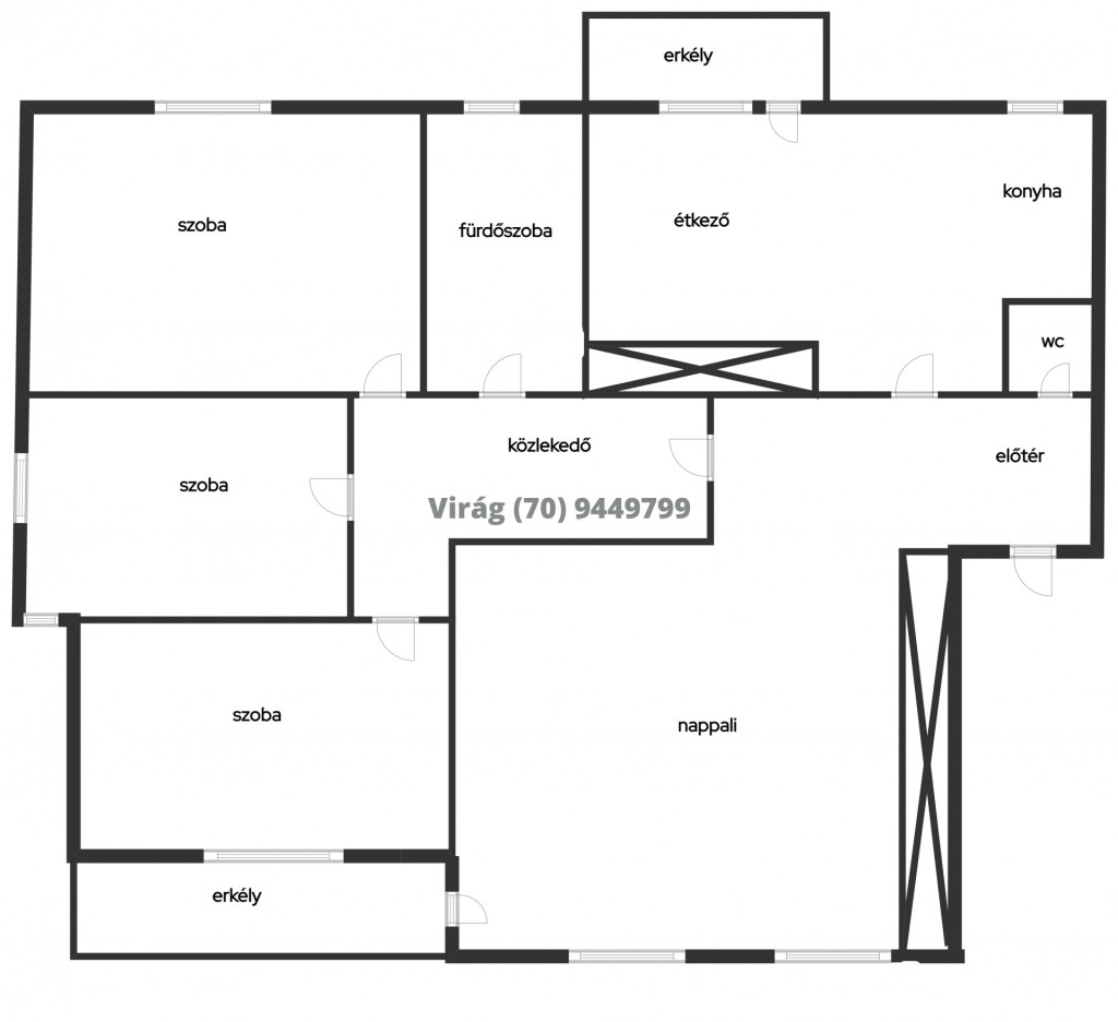 - Előszoba, konyha + étkező, tágas nappali, két külön nyíló szoba, közlekedő, fürdő,