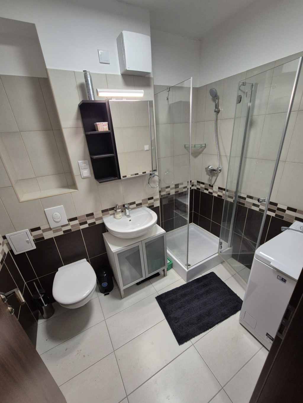 •zuhanyzóval és beépített elszívóval felszerelt fürdőszoba