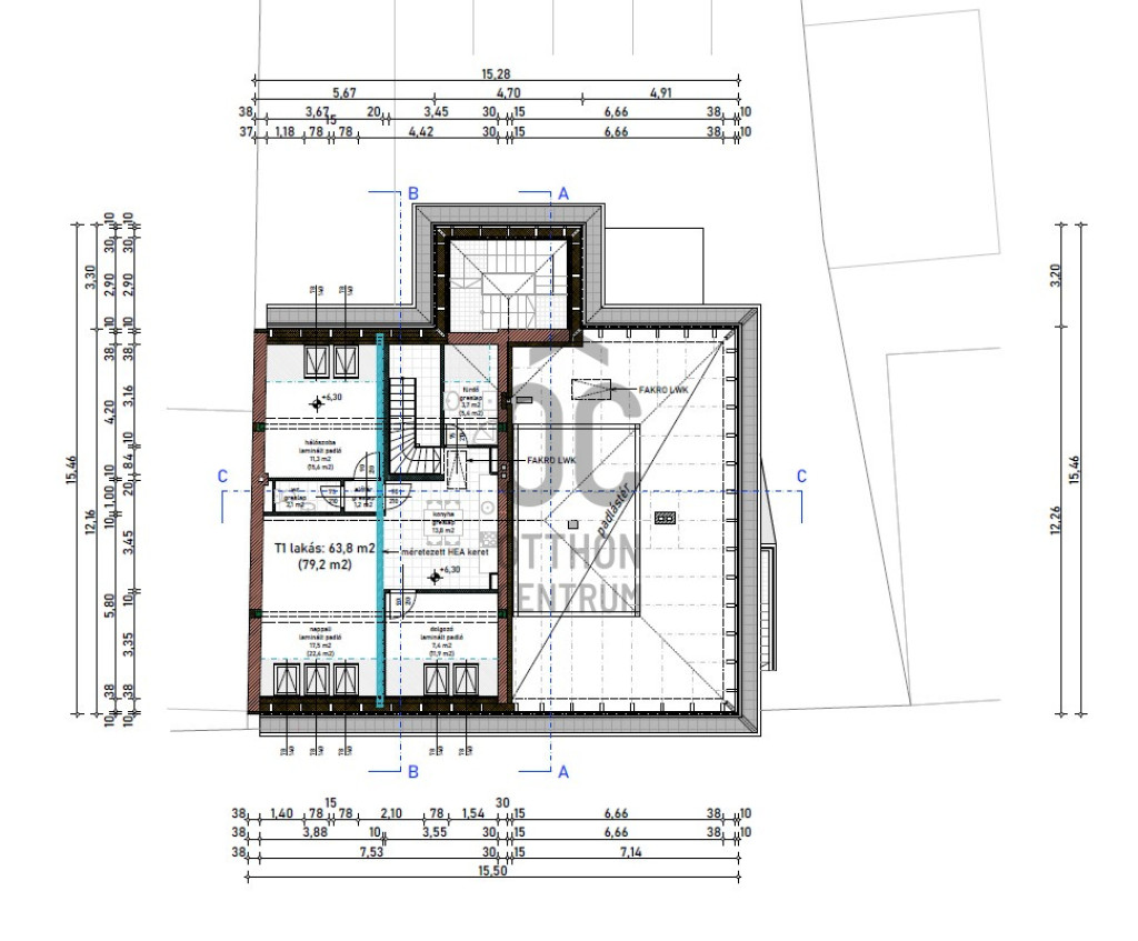 A lakás bruttó 79,2 nm nettó 63,8 nm, tetőtéri lakás.