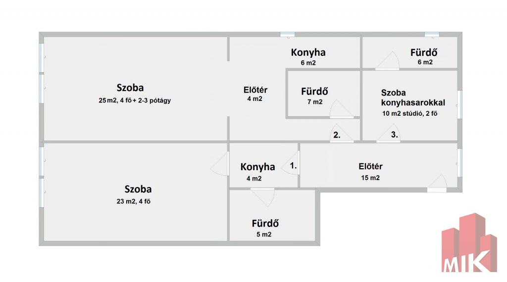 (I. 4 fő; II. 4+2 fő; III. 2 fő) Eddigi tapasztalat nagyjából 1 éves bérlői ciklus, üresen állás egyáltalán nem jellemző.