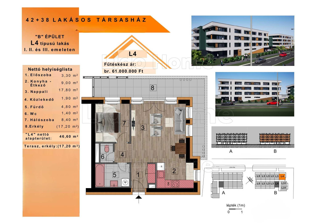 B épület 1. emelet L4. 101 lakás: 46,6 m2 + 17,2 m2 erkély