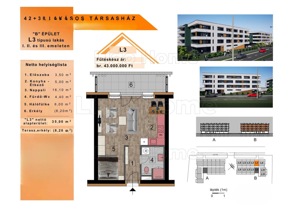 B épület 1. emelet L3. 102 lakás: 35 m2 + 8,2 m2 erkély