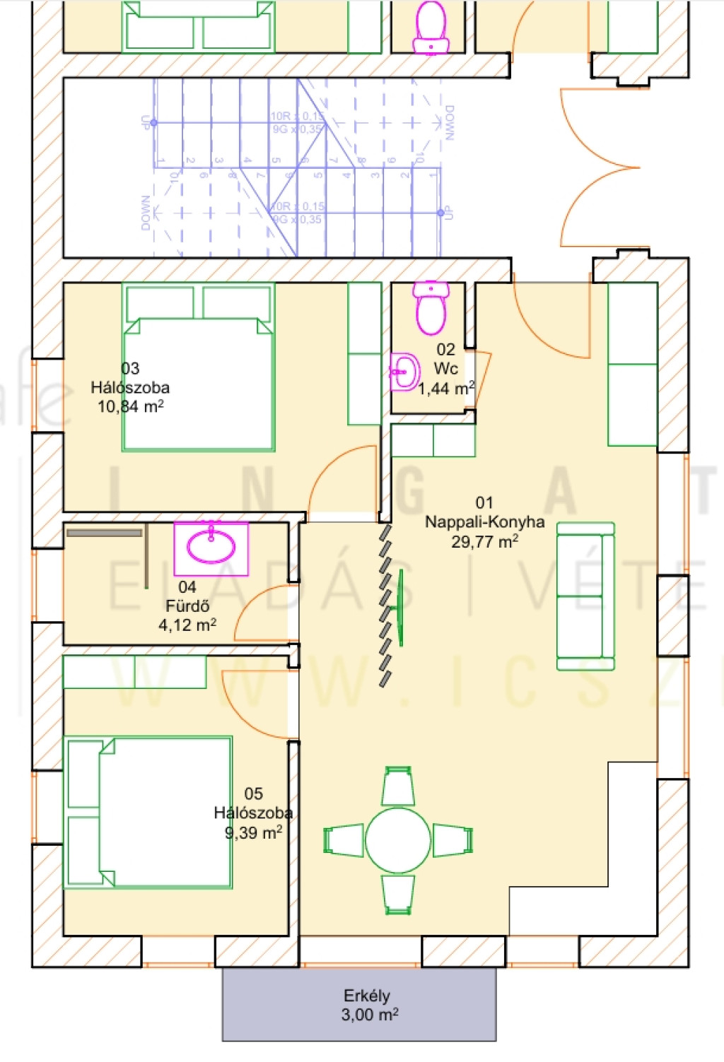 Az ingatlan elosztása: Nappali + étkező + konyha, 2db szoba, fürdő, előtér, wc és egy 3 m2-es erkély