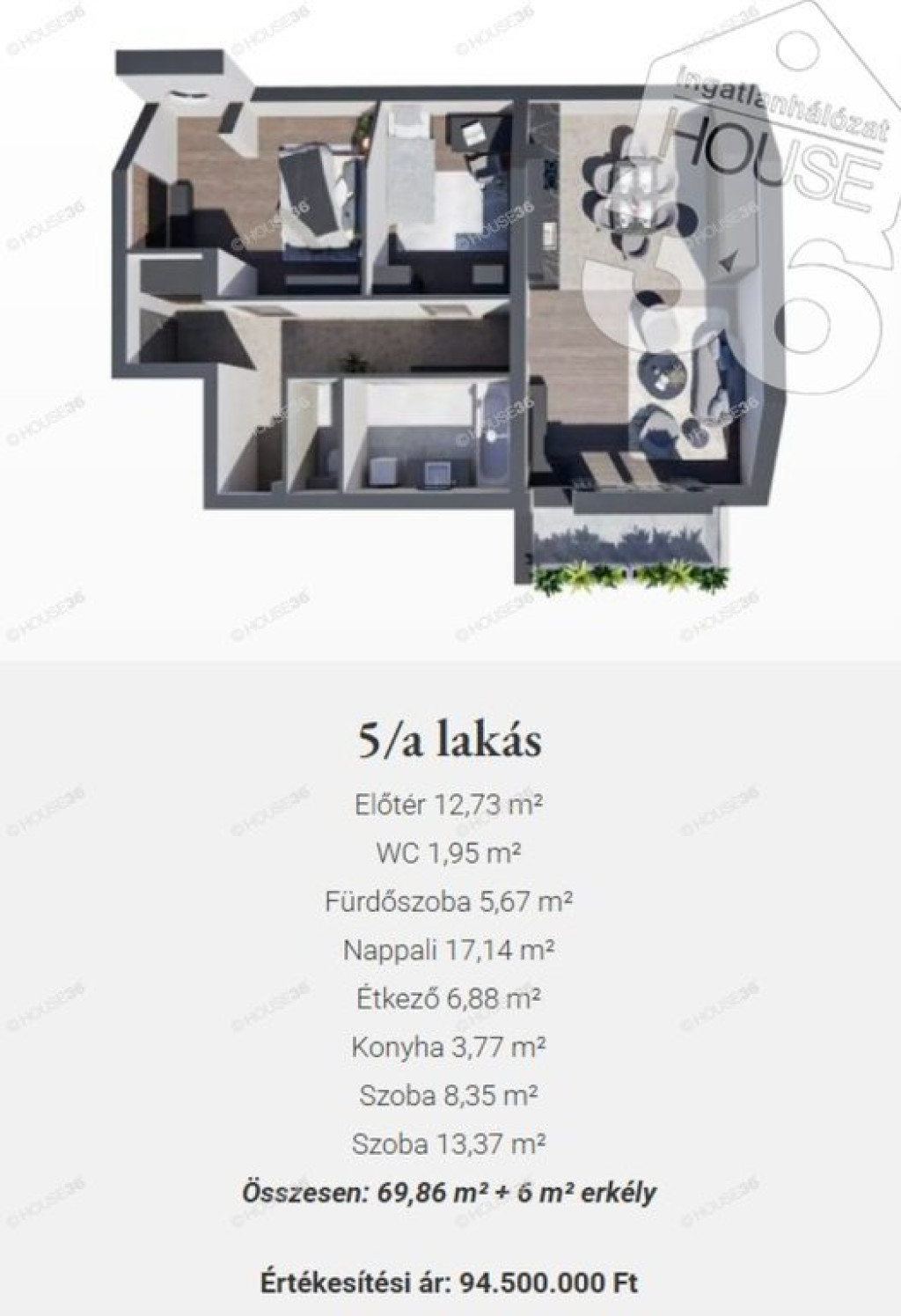 5/a lakás, 69,86 m2, nappali + 2 szoba, 6 m2 erkély