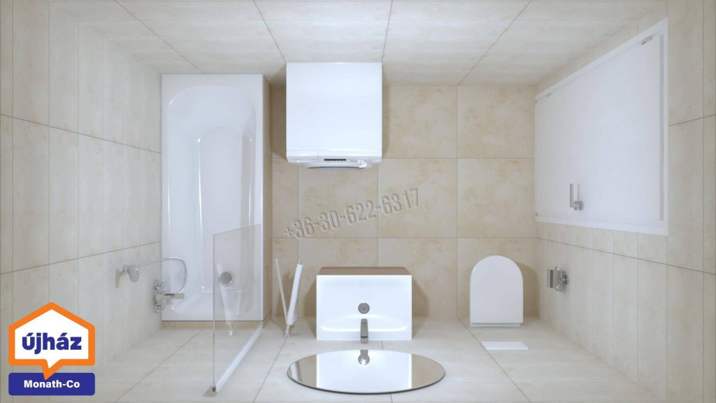 - Fürdőszoba: Alföldi fali WC, Como mosdó (60 cm) + szekrény, 170×75 cm fürdőkád, Kludi csaptelepek