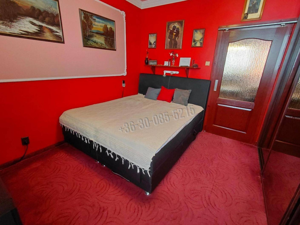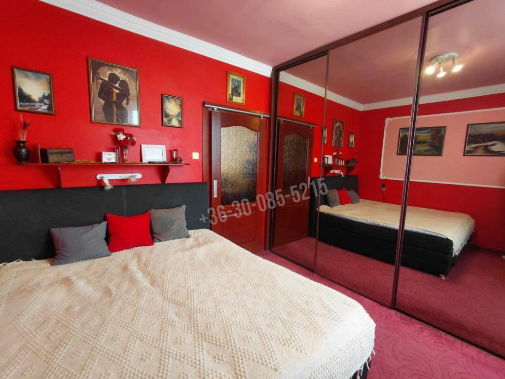 - Hálószoba: padlószőnyeg, nagyméretű tükrös gardrób, motoros boxspring franciaágy