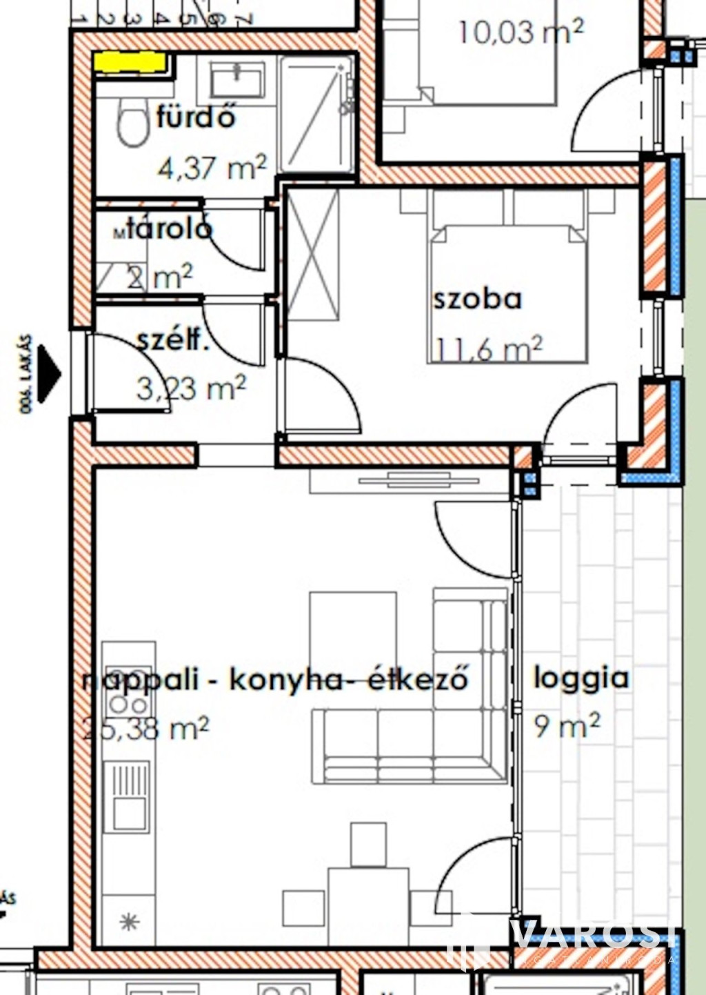 A 1 db amerikai konyhás nappalival, 1db hálószobával, 1 db fürdőszobával, közlekedőkkel, loggiával rendelkezik.