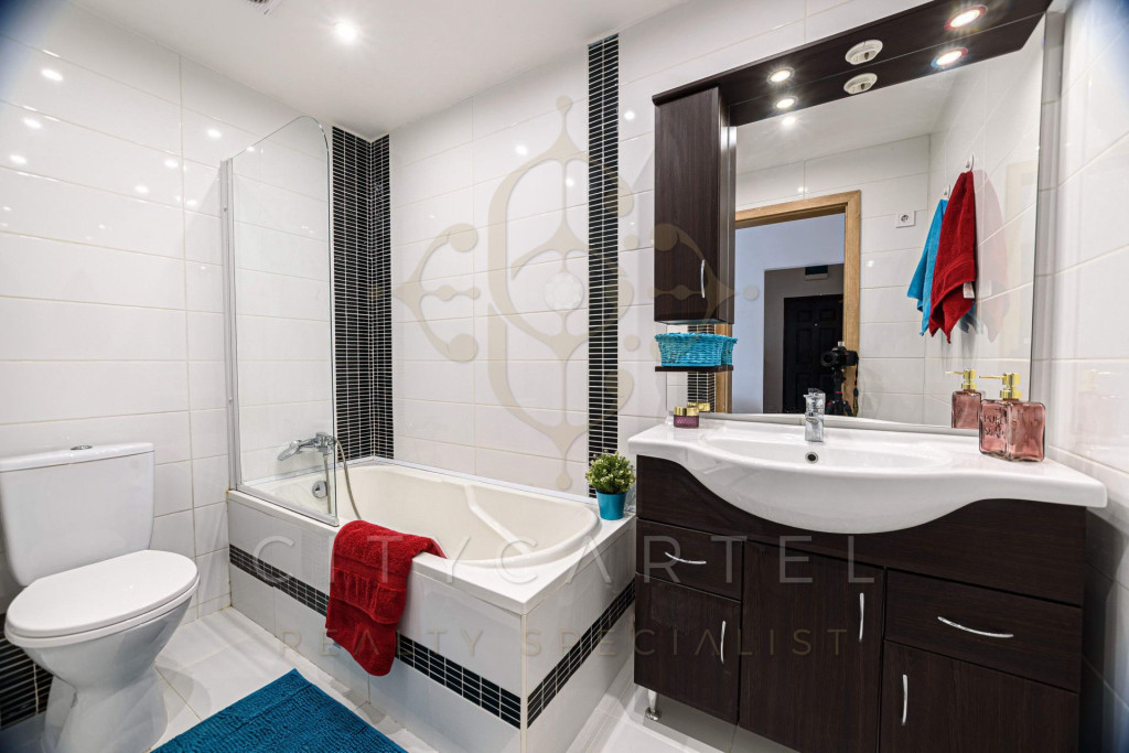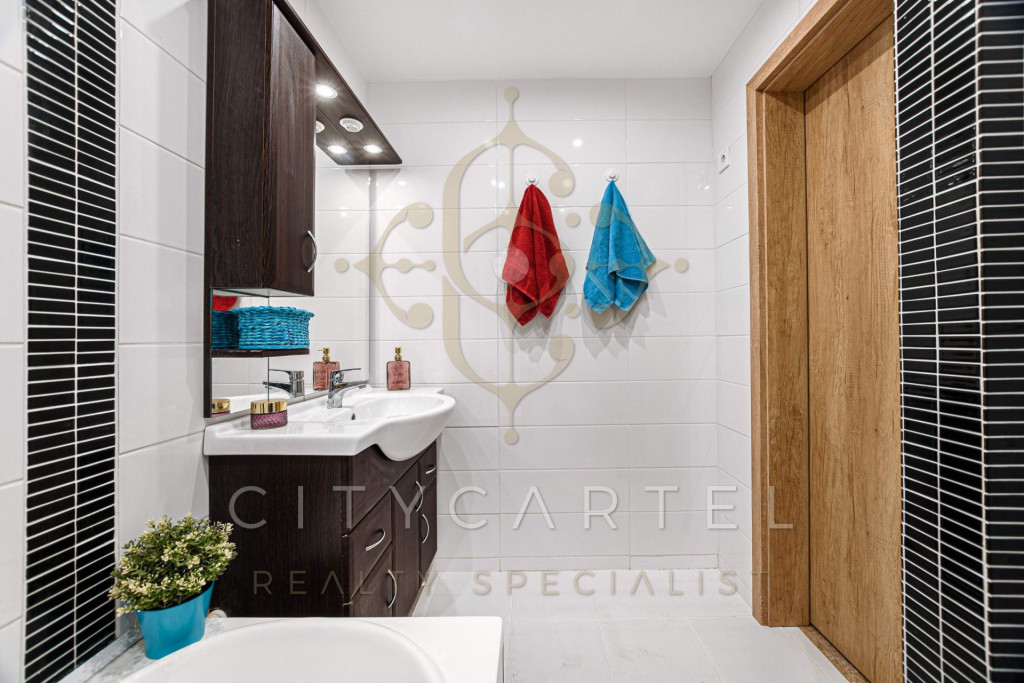 A fürdőszoba felújított és bővített, a mosógép külön helyiségbe került.