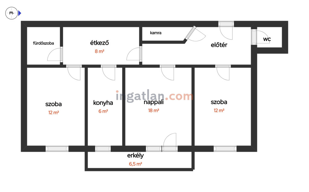 Helyiségek: 3 szoba, konyha, étkető, előszoba, tároló, fürdőszoba, wc
