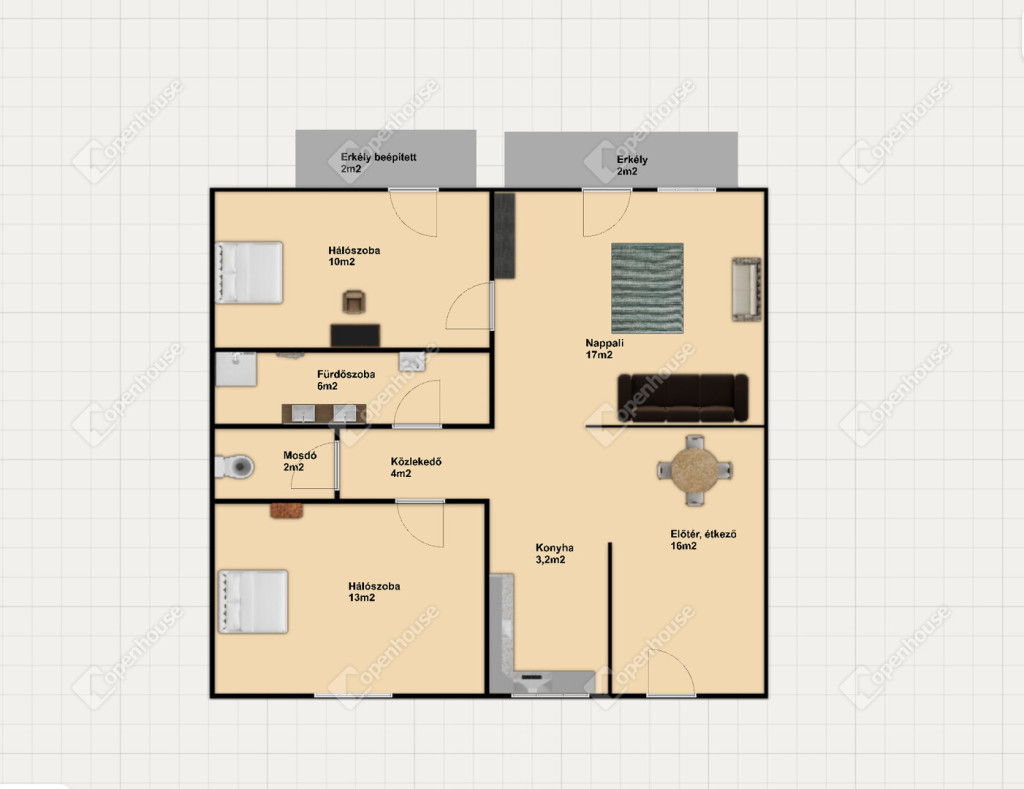 3 szoba (2 hálószoba + tágas, napfényes nappali)