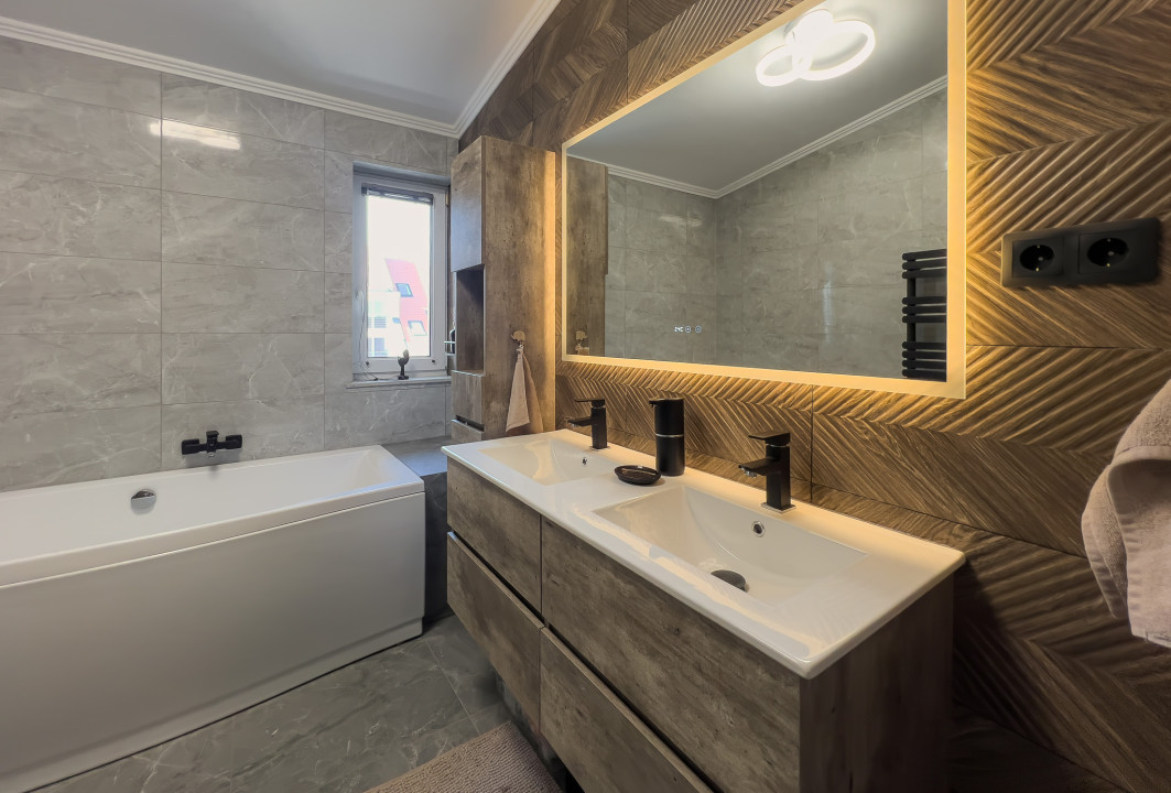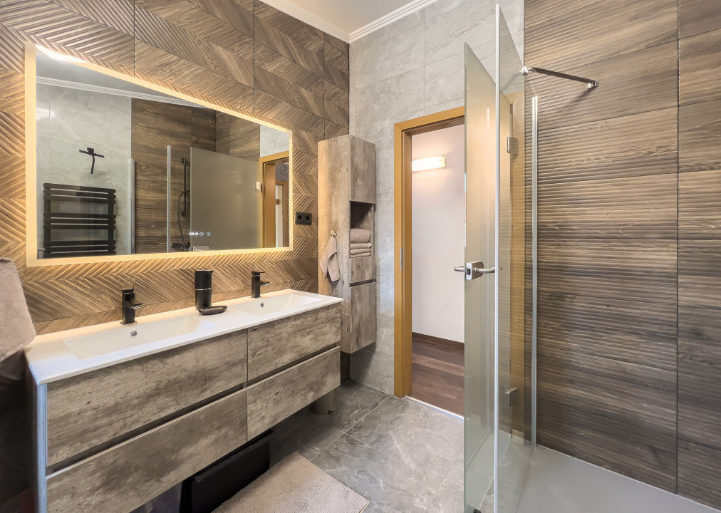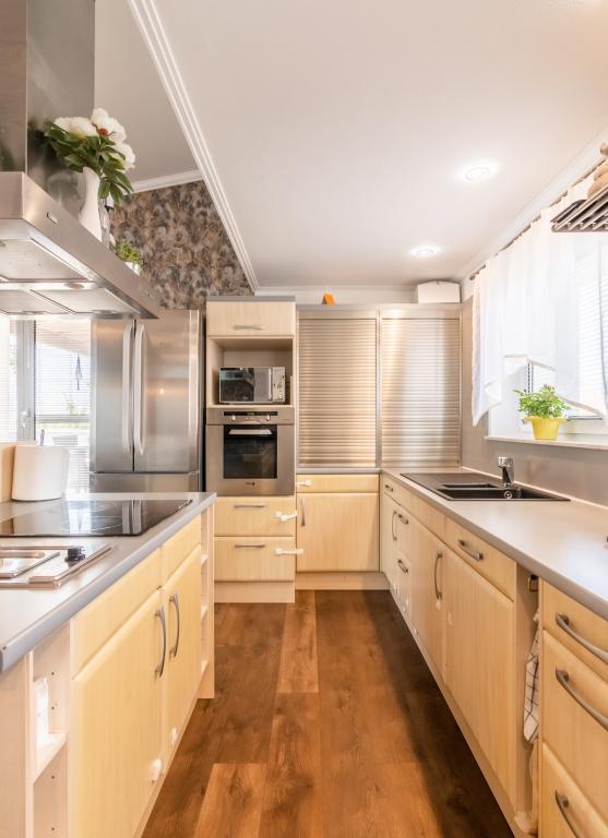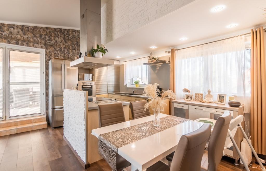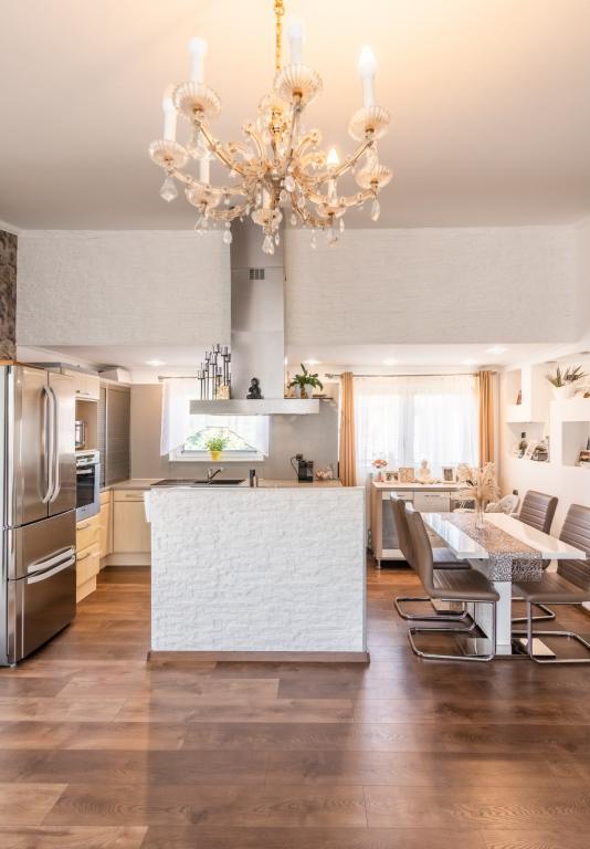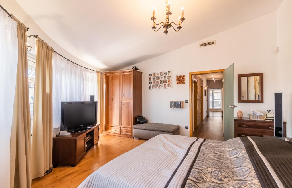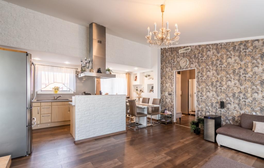 A konyha magas szinten gépesített, a lakótér igényes, exkluzív kialakítású. A burkolatok minőségi járólapok és laminált parketta , a nyílászárók műanyagok, elektromos redőnyökkel, szúnyoghálóval felszerelve. A lakás fűtéséről egy villanykazán gondoskodik, padlófűtéssel, a hűtést központi klíma biztosítja.