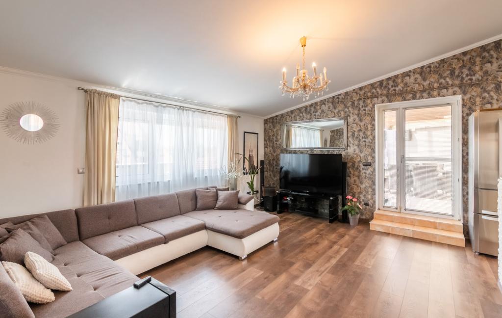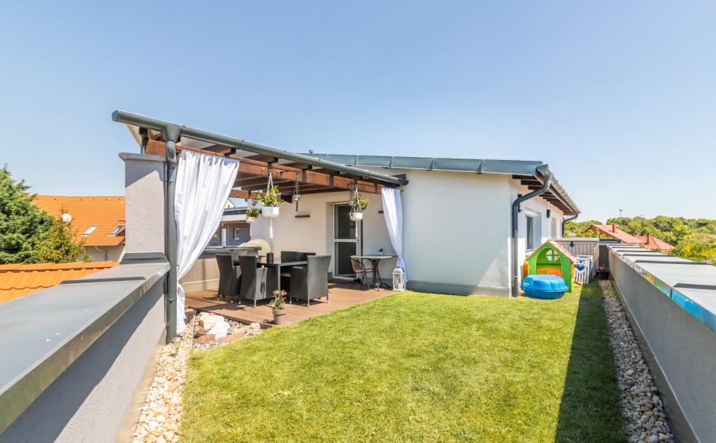 A déli fekvésű, rendkívül világos lakás különlegessége, hogy a nagy alapterületű, legfelső szinten elhelyezkedő lakást körülöleli, a 76 nm összterületű fedett terasz és füvesített kert-rész. Az ingatlan helyiségei: konyha étkezővel, nagy nappali, 2 hálószoba, káddal és zuhanyzóval felszerelt fürdőszoba, wc és háztartási helyiség.