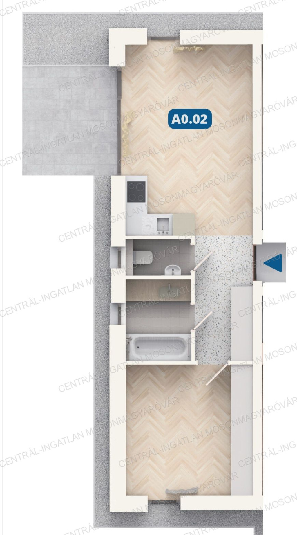 - Az A0.02-es számú földszinti lakás hasznos alapterület 47.225 m2. A lakás határoló falain belüli terület 43.4 m2, + terasz 7.65 m2 (hasznos alapterület: határoló falakon belüli terület + terasz fele). A lakáshoz 30 m2 saját használatú kert is tartozik.