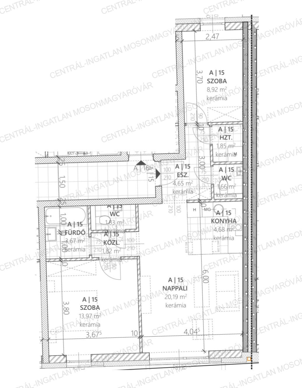 - Az A1.15-as számú lakás 3 szobás (nappali + 2 szoba), 1. emeleten található. Hasznos alapterület 65.58 m2, franciaerkélyes. Hasznos alapterület: határoló falakon belüli teljes terület, (kivéve strangok).