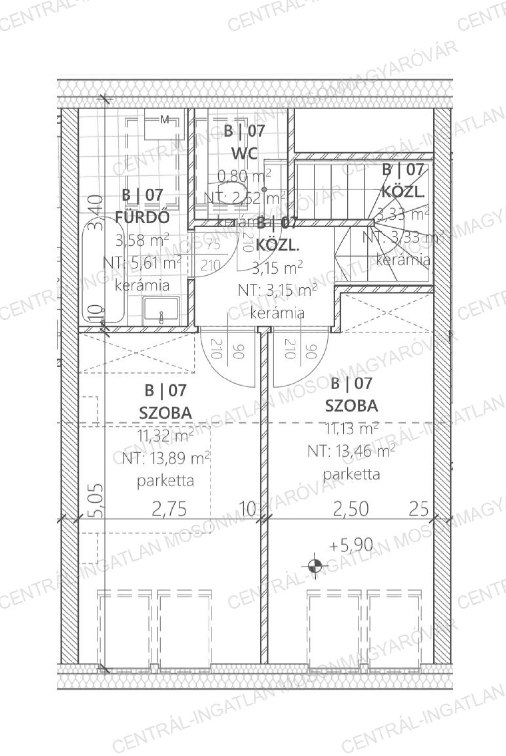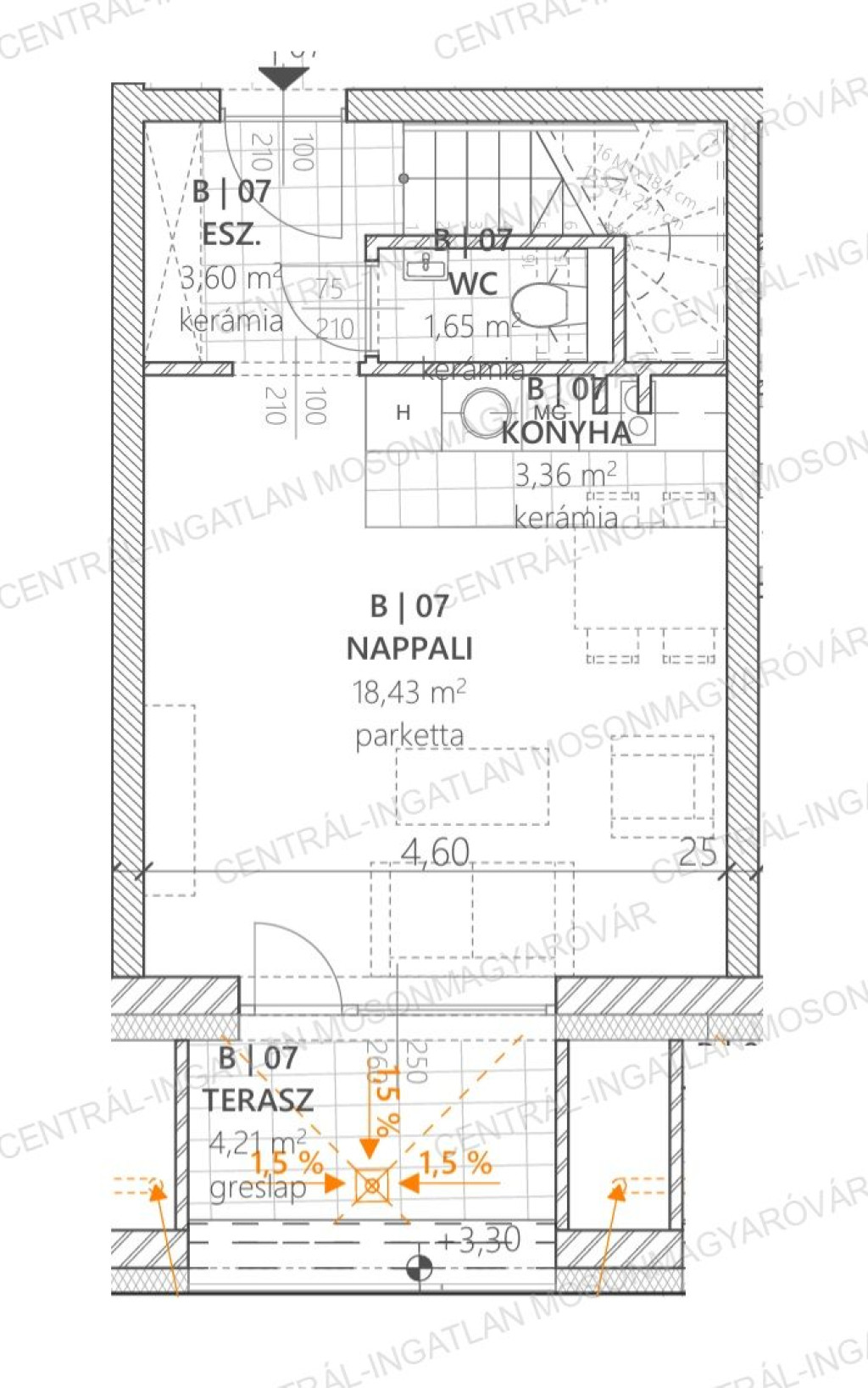 - A B1.07-es számú lakás 3 szobás (nappali+ 2 szoba), belső kétszintes, hasznos alapterület 67.77 m2. A lakás határoló falain belüli terület 66.37 m2, + terasz 4.21 m2 (hasznos alapterület: határoló falakon belüli terület + terasz fele).