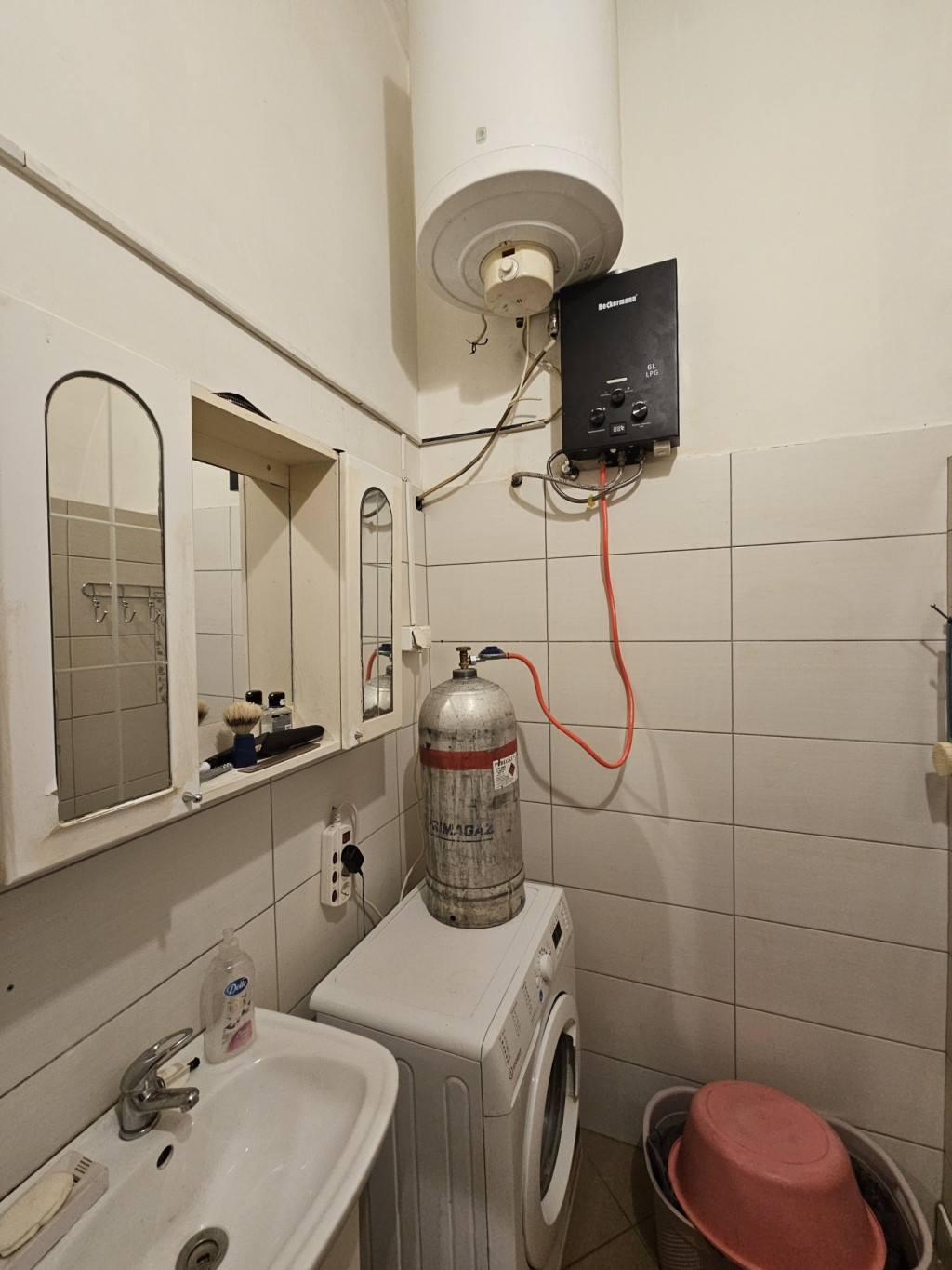 A fűtés egyedi, kályhával megoldott, ami kellemes, otthonos hangulatot ad a lakásnak. A meleg vizet villanybojler biztosította, amely jelenleg meghibásodott, így átmeneti megoldásként palackos gázbojler üzemel.