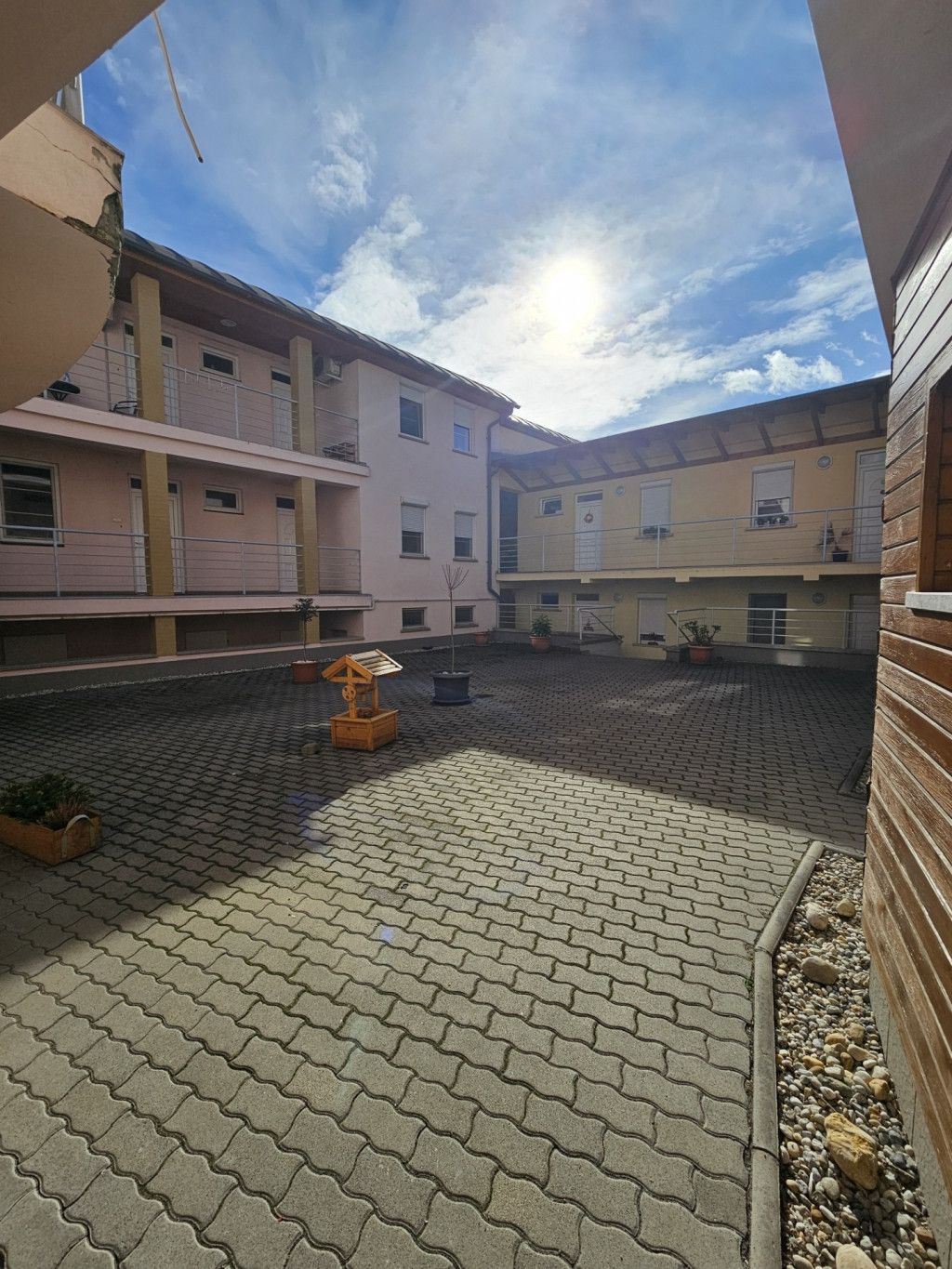 A társasház zárt, térköves udvarral rendelkezik, ahol a garázsok is helyet kaptak. A lakás tulajdonosai rendelkeznek saját garázzsal, amely a lakás új vevője részére megvásárolható, külön megállapodás alapján, 8 millió forintos vételáron. Ez a belvároshoz közeli elhelyezkedés miatt különösen értékes lehetőség. Az ingatlanhoz tartozik még egy közös tároló is, mely akár bicikli, babakocsi tárolásra is megfelelő.