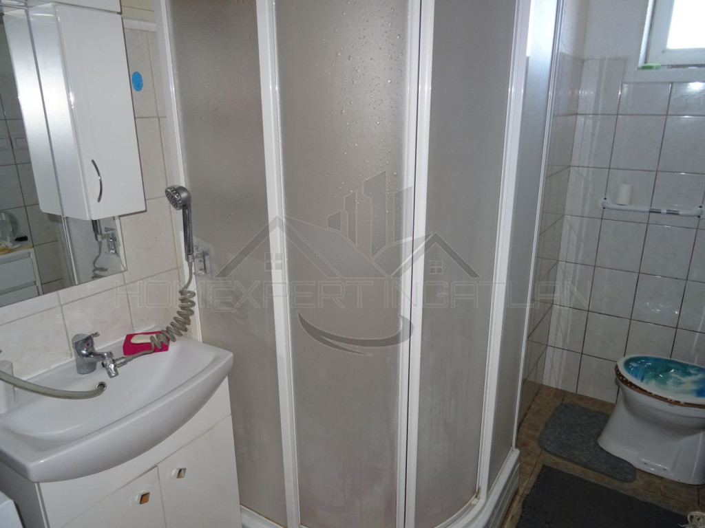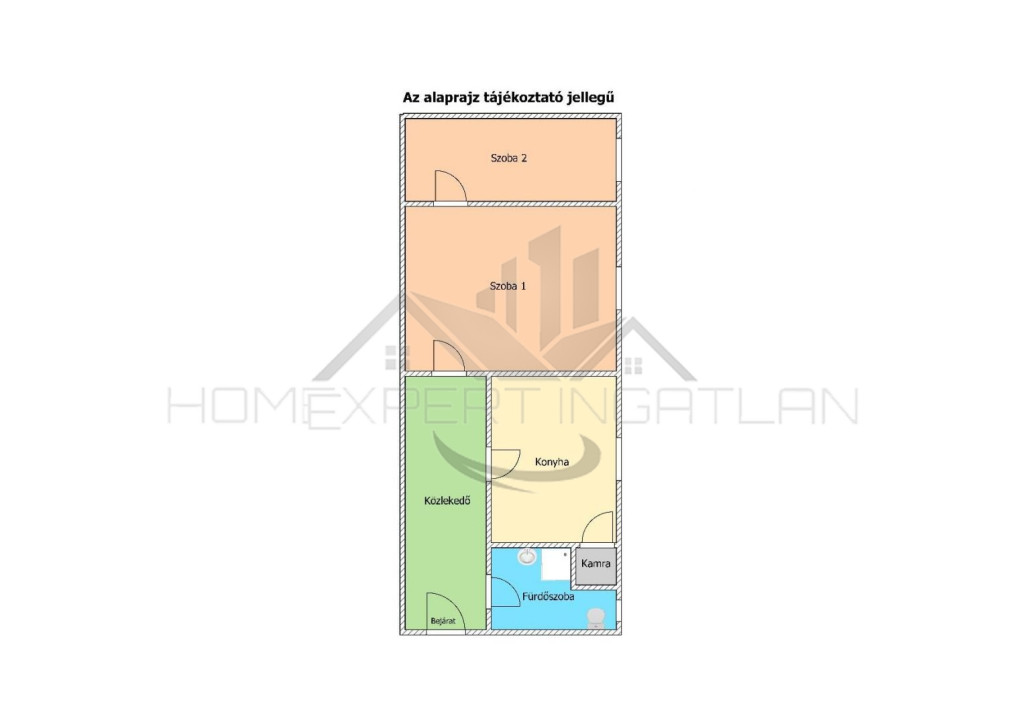 A szobák egymásba nyílnak. A fürdőszoba és WC egy helyiségben található, és zuhanykabin került beépítésre. A konyhából egy kis kamra nyílik.