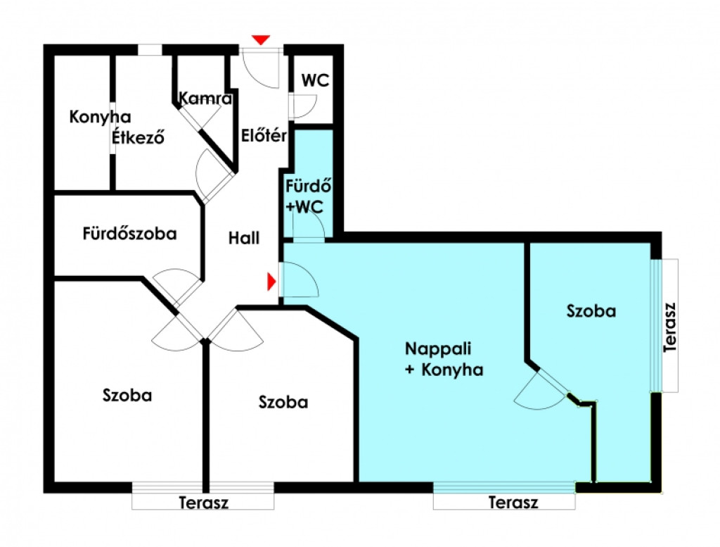 előtér, két szoba, fürdő, konyha + étkező, kamra, WC.