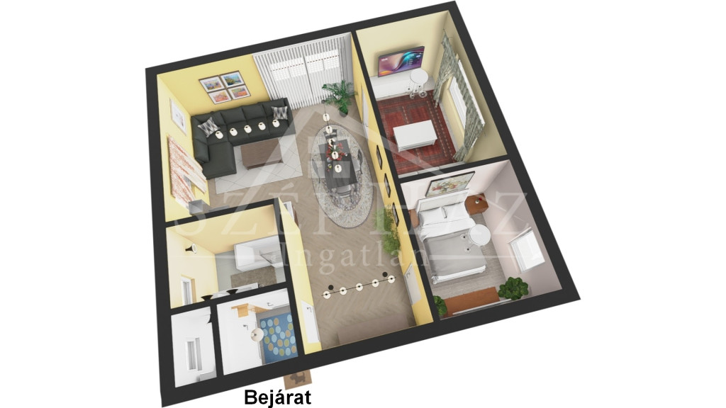 67 m²-es praktikus elrendezés: amerikai konyhás nappali + 2 külön nyíló szoba