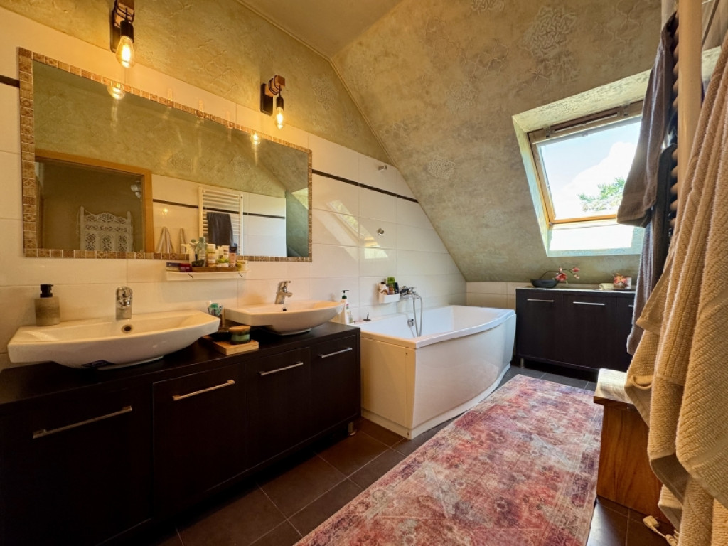 Az emeleti szinten kádas fürdőszoba dupla mosdó,wc-bidé, itt kapott helyet a mosógép is.Két nagy méretű szoba is az emeleti szinten található.