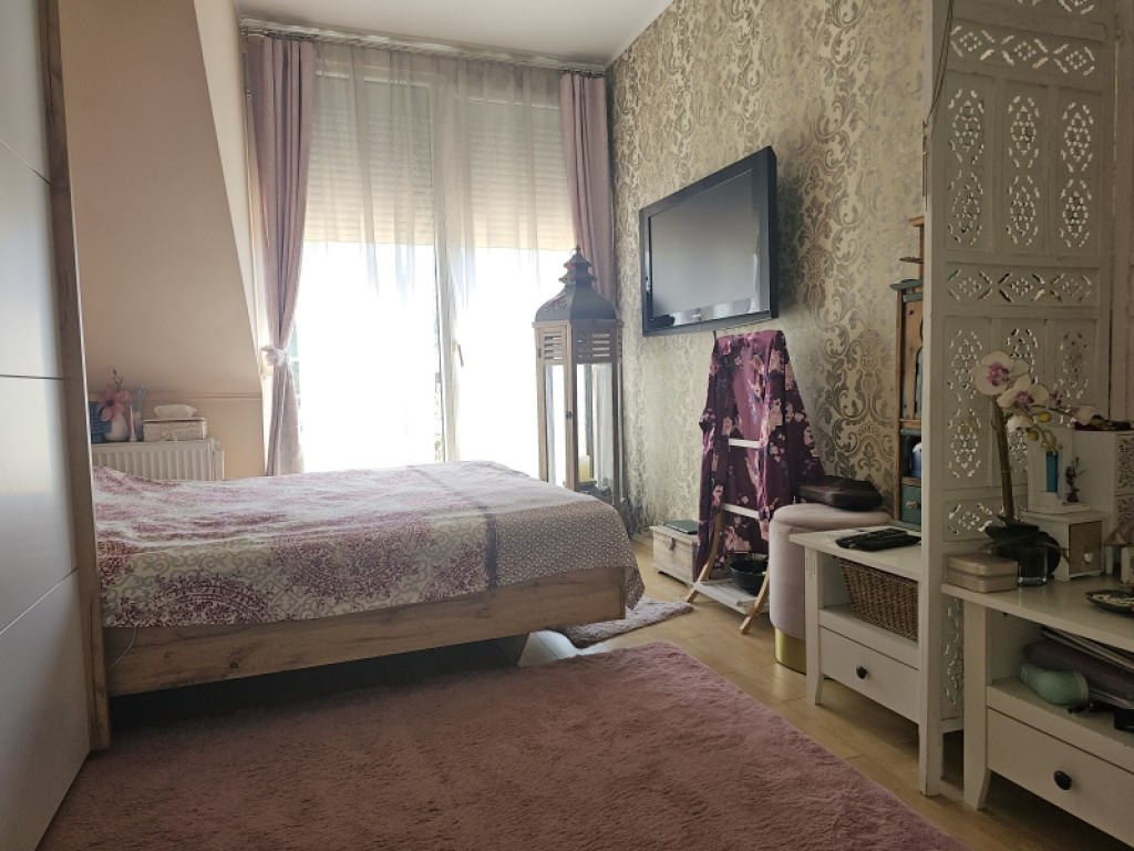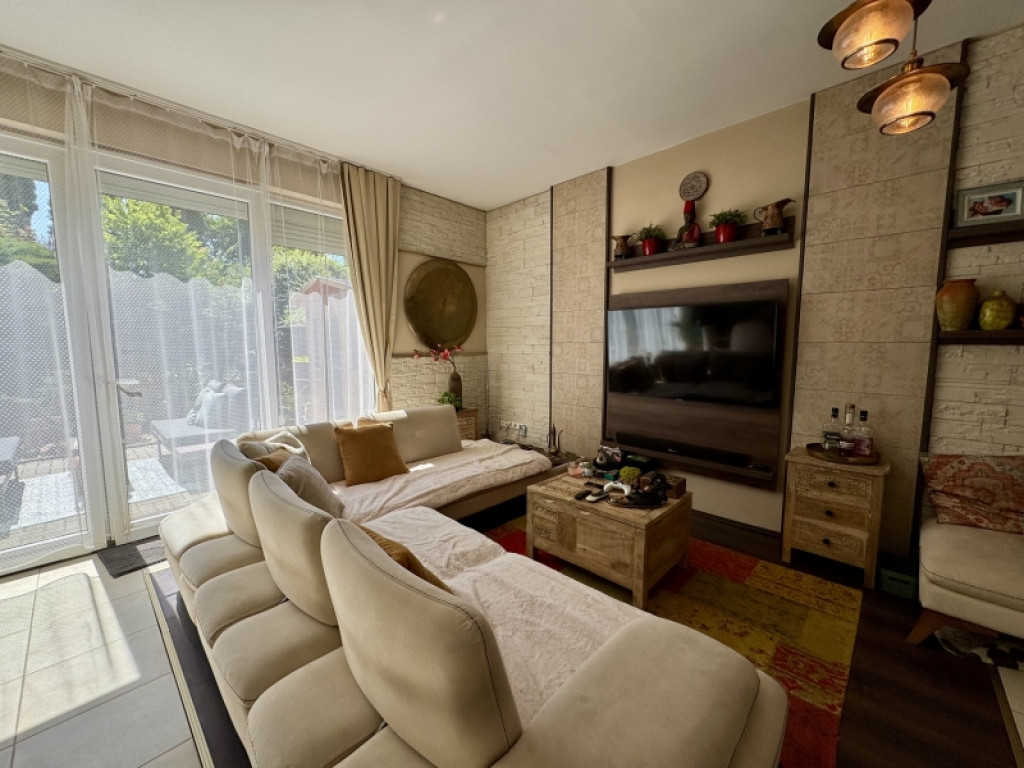 A lakásba érve egy tágas egy légtérben lévő előszoba-nappali-konyha étkező lett kialakítva. Három oldalról ablakokkal, ennek köszönhetően gyönyörű napfényes és tágas . A különleges nyugalmat árasztó déli terasz kerti csobogóval, virágokkal.