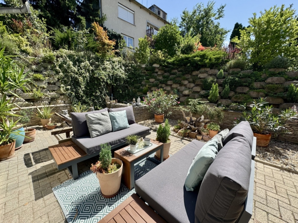 A belső két szintes ingatlanhoz tartozik egy csodálatosan kialakított kert, ebből kettő teraszként és egy kerti rész,ahol pezsgőmotoros polipropilén medence, pari házikó,szőlővel befuttatott pergola, sütögető és étkező rész lett kialakítva.