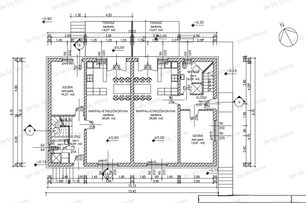 Nagy terasz és 300 nm-es telek rész tartozik hozzá lakásonként.