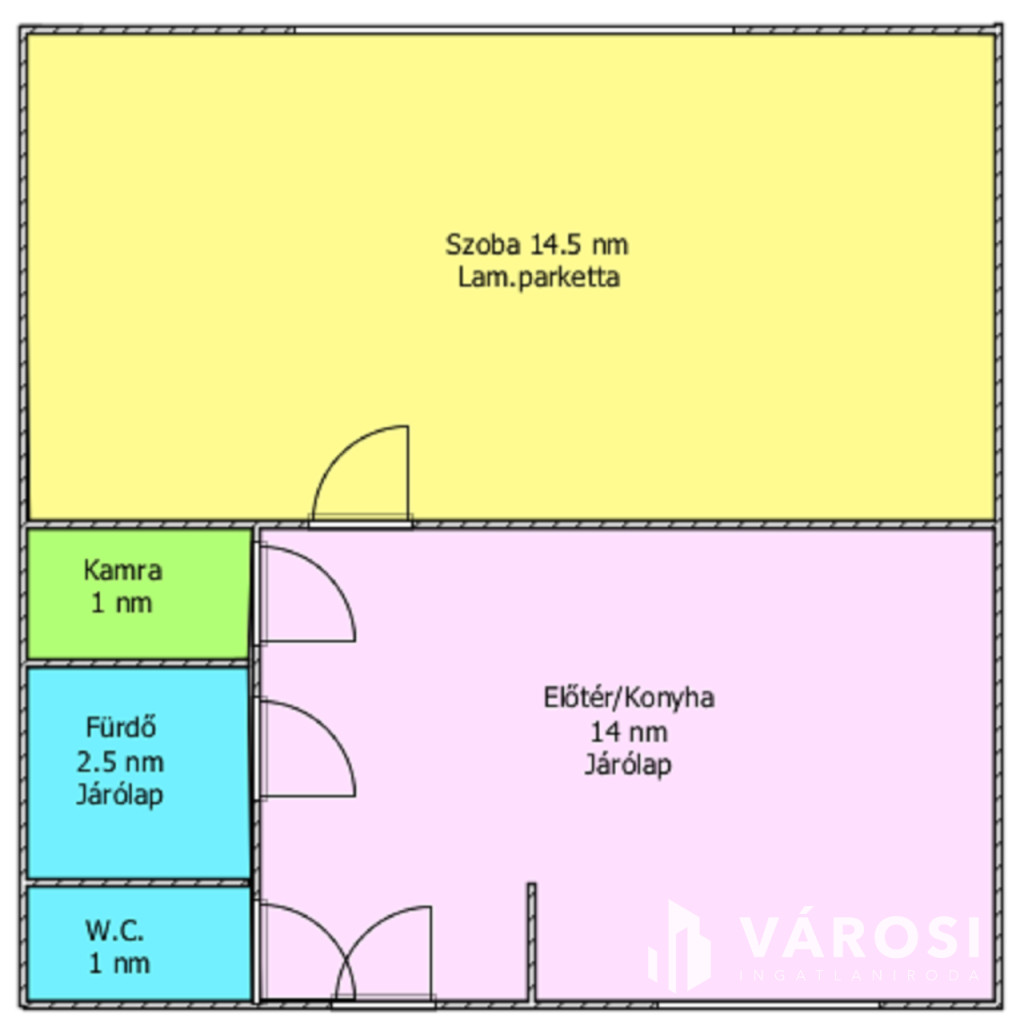 Helyiségei: 1 szoba, konyha, kamra, fürdőszoba, külön nyíló W.C.